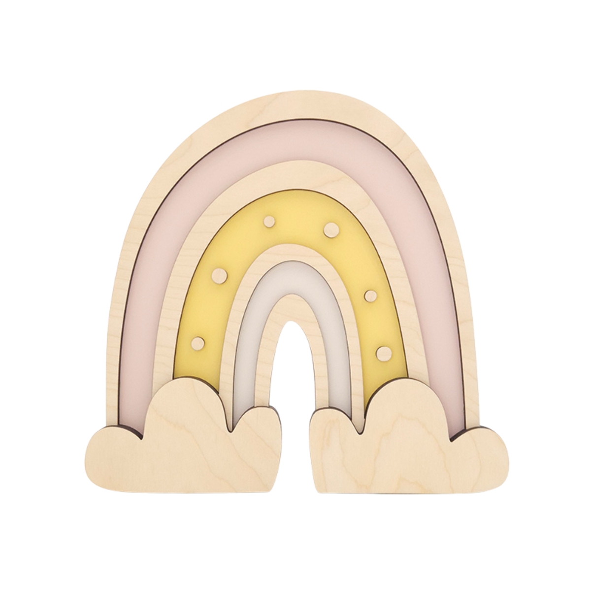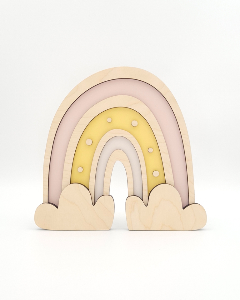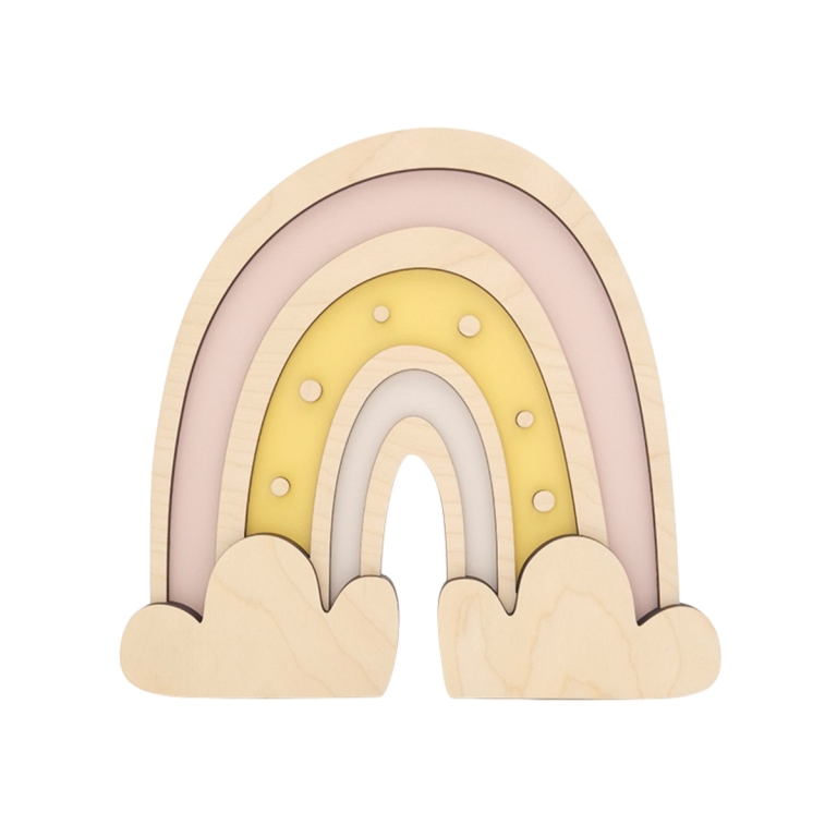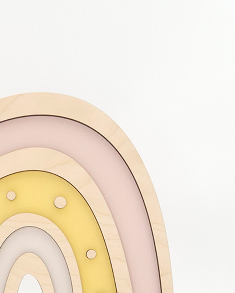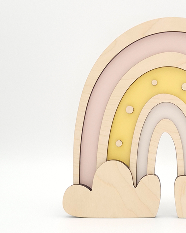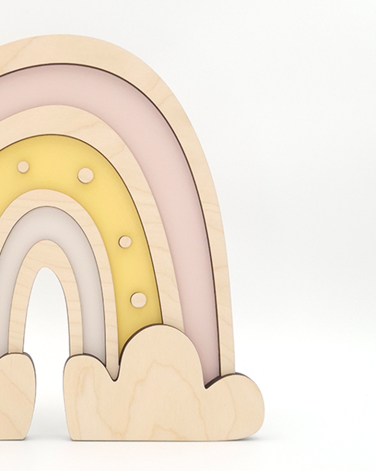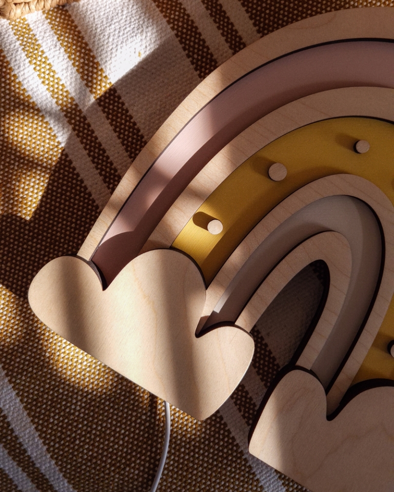 Lampka dekoracyjna Tęcza wyróżnia się nie tylko wyjątkowym wyglądem, ale również wysoką jakością. Model wykonano z naturalnego, certyfikowanego drewna, które pomalowano zostało bezpiecznymi dla dzieci farbami. Model oferuje dwie barwy światła (2700K lub 4000K) oraz dwa sposoby zasilania (sieciowo przez kabel USB lub trzema bateriami AA). Dodatkowo wersja sieciowa oferuje sześciostopniowy ściemniacz światła.