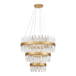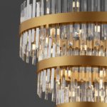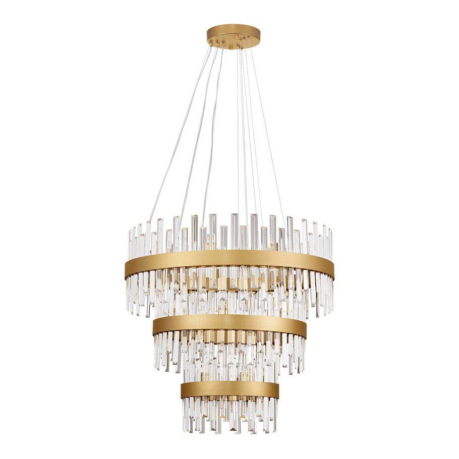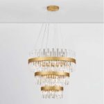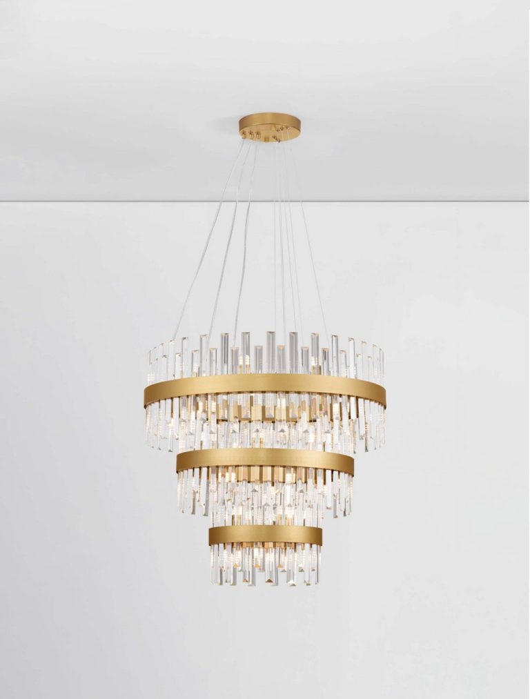 Oferowany żyrandol w eleganckim stylu składa się z trzech pierścieni o różnych średnicach (35, 55 oraz 75 cm), szklanych elementów dekoracyjnych oraz minimalistycznej podsufitki. Żyrandol pierścieniowy Cholula 3 doskonale pasuje do aranżacji w stylu glamour oraz nowoczesny glamour. Kryształowe elementy przepięknie odbijają światło, a wraz z metalowymi pierścieniami w złotym kolorze, oświetlenie nadaje przestrzeni ciepła i ponadczasowej elegancji.