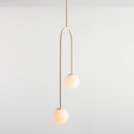 Pionowa lampa sufitowa na kremowym stelażu wykonana została z metalu i szkła, dzięki czemu jest ponadczasowa i niezwykle elegancka. Jej stelaż posiada dwa wygięte ku dołowi ramiona, na ich końcach znajdują się szklane klosze o klasycznym kulistym kształcie.