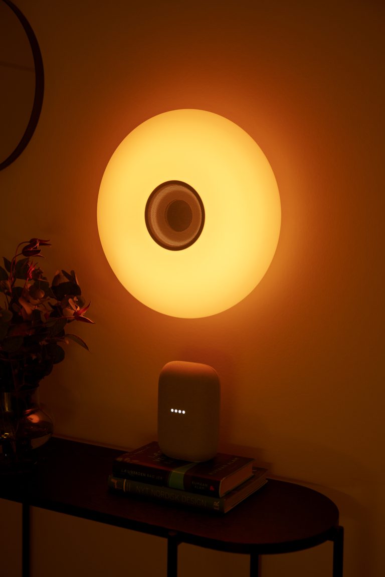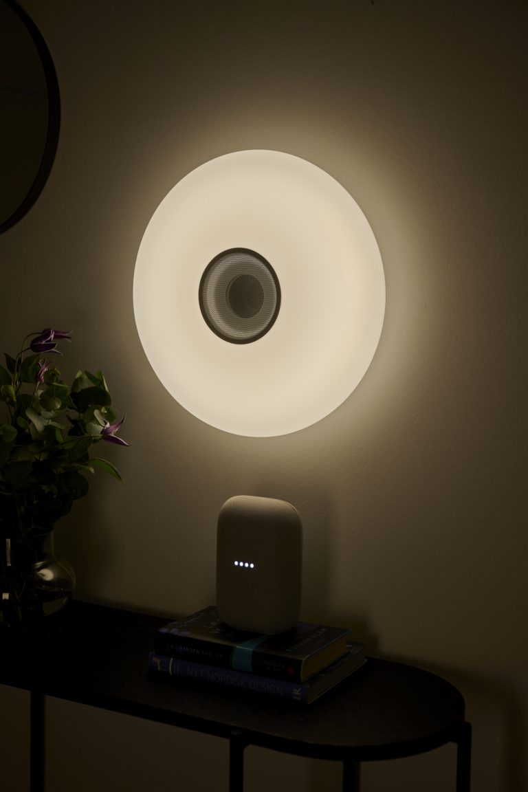 Plafon sufitowy Djay Smart Color ma okrągły kształt, średnicę 40 i wysokość 9 cm, dlatego doskonale sprawdza się nawet w niższych pomieszczenia, dokładnie oświetlając także duże wnętrza. Polecana lampa nowoczesna wykonana jest z wysokiej jakości tworzywa sztucznego w białym odcieniu, dzięki czemu jest trwała oraz doskonale wpisuje się w aranżacje o różnej kolorystyce. Plafon z głośnikiem Djay Smart Color najlepiej prezentuje się we wnętrzach nowoczesnych i minimalistycznych.
