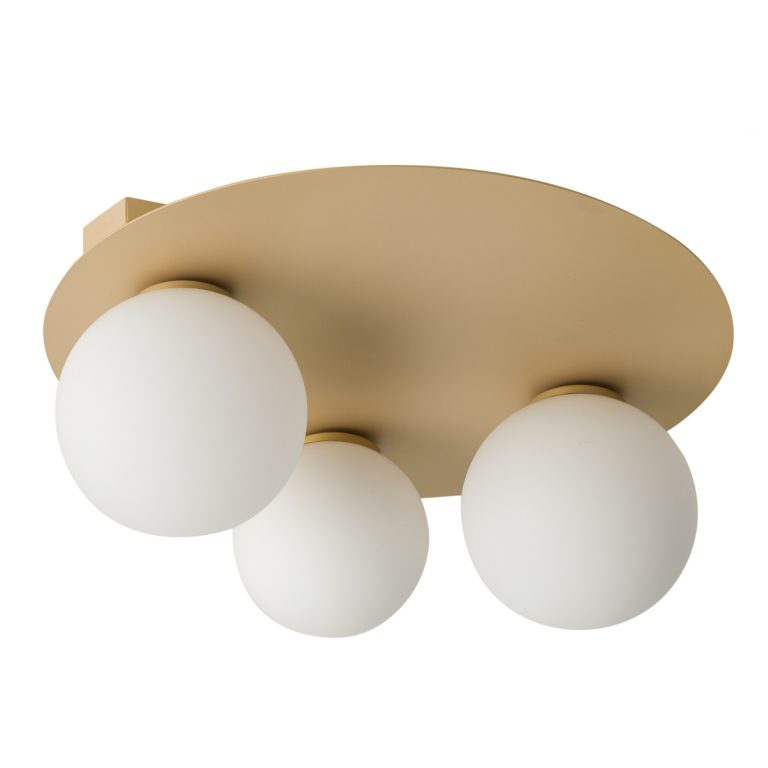 Lampa sufitowa Bubble Ring 3 składa się z płaskiego talerza wykonanego ze stali lakierowanej na złoto oraz aż trzech źródeł światła w postaci kulistych kloszy ze szkła. Mlecznobiałe kule przepięknie rozpraszają światło, dzięki czemu jest ono przyjazne dla naszych oczu. Białe klosze idealnie współgrają z podsufitką w kolorze matowego złota. To niezwykle modne połączenie kolorystyczne, które doda elegancji każdemu wnętrzu.