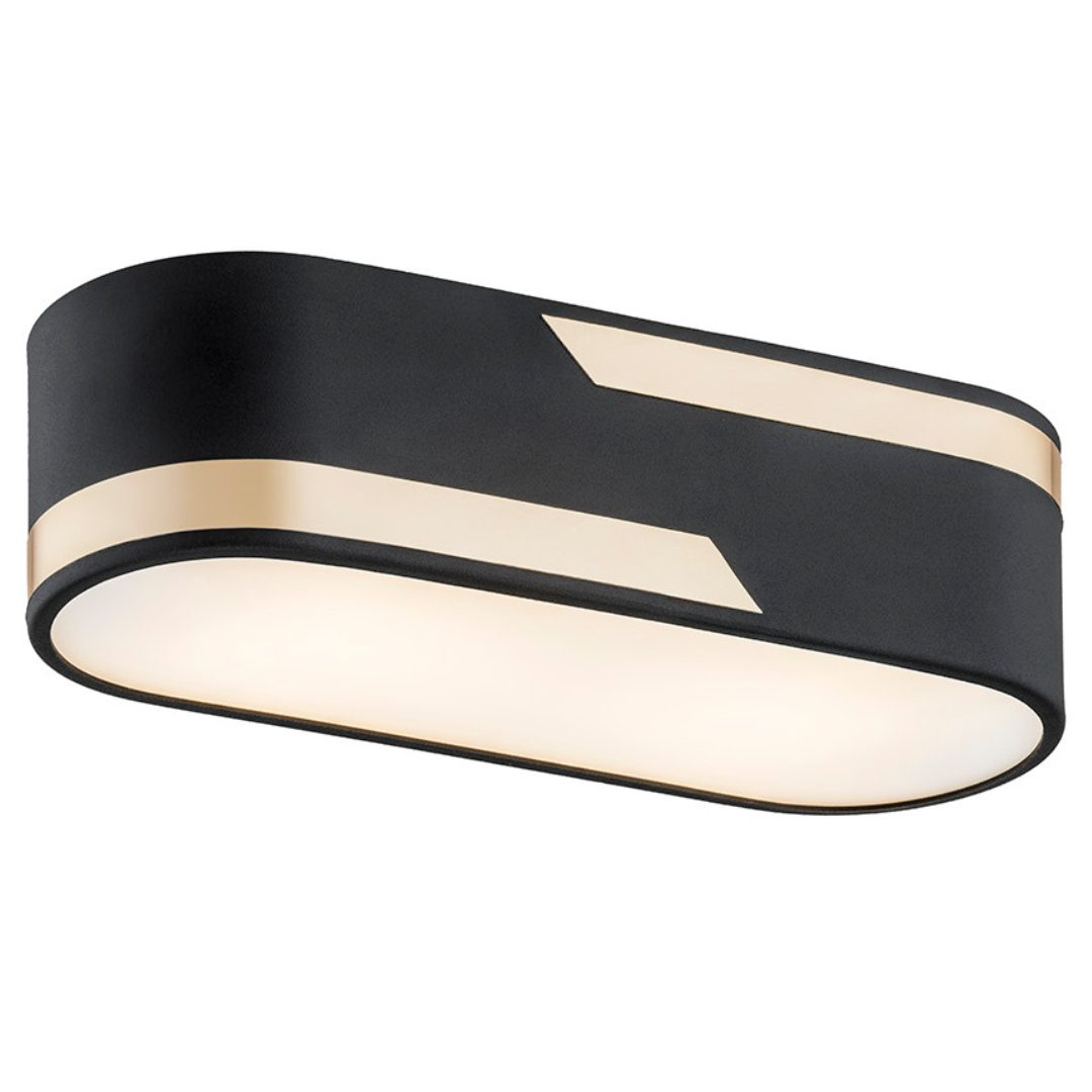 Czarna plafoniera sufitowa ma klasyczny kształt równoległoboku, który wzbogacony został o zaokrąglone boki oraz złote elementy wykończenia. Lampa do salonu jest szeroka na 30 cm, jej głębokość równa się 11 cm, a od sufitu odchodzi na odległość 7,5 cm. Jest to więc mała lampa przysufitowa, którą z powodzeniem oświetlisz także niewielkie pomieszczenia – nasza czarna plafoniera nie dominuje przestrzeni, tylko ją subtelnie uzupełnia i uatrakcyjnia.