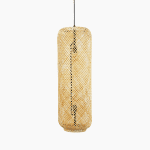 Wisząca lampa Boom wyróżnia się podłużnym, plecionym kloszem w kształcie tuby, wykonanym z naturalnego bambusa w ciepłym, beżowym odcieniu. Dzięki ażurowej strukturze światło, swobodnie przenika, tworząc dekoracyjny efekt świetlny. Uzupełnieniem klosza jest metalowy stelaż w czarnym kolorze, który dodaje beżowej lampie charakteru.
