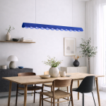 Głównym elementem modelu Biscuit jest podłużny klosz z falowanym, finezyjnym wykończeniem przypominającym brzegi herbatnika. Dzięki swojej unikatowej formie, doskonale sprawdzi się w kuchni i jadalni – na przykład zawieszony nad stołem lub wyspą kuchenną. Lampa w kolorze ultramaryny może stać się ciekawym kontrastem dla stonowanych aranżacji, będąc efektownym detalem, który dekoruje całe wnętrze. Możesz wykorzystać ją również do zaaranżowania niebieskiej kuchni, z którą stworzy bardziej monochromatyczną całość.