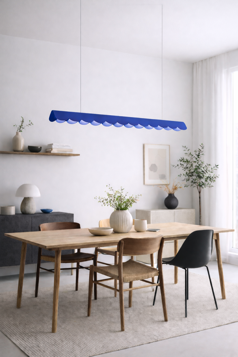 Głównym elementem modelu Biscuit jest podłużny klosz z falowanym, finezyjnym wykończeniem przypominającym brzegi herbatnika. Dzięki swojej unikatowej formie, doskonale sprawdzi się w kuchni i jadalni – na przykład zawieszony nad stołem lub wyspą kuchenną. Lampa w kolorze ultramaryny może stać się ciekawym kontrastem dla stonowanych aranżacji, będąc efektownym detalem, który dekoruje całe wnętrze. Możesz wykorzystać ją również do zaaranżowania niebieskiej kuchni, z którą stworzy bardziej monochromatyczną całość.