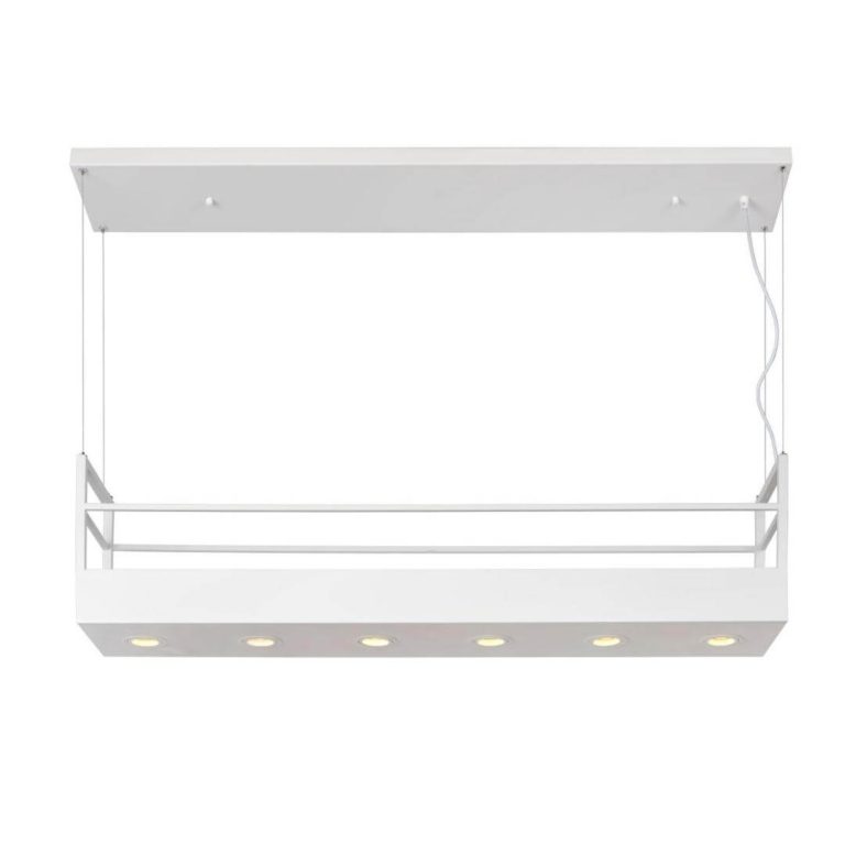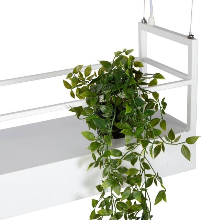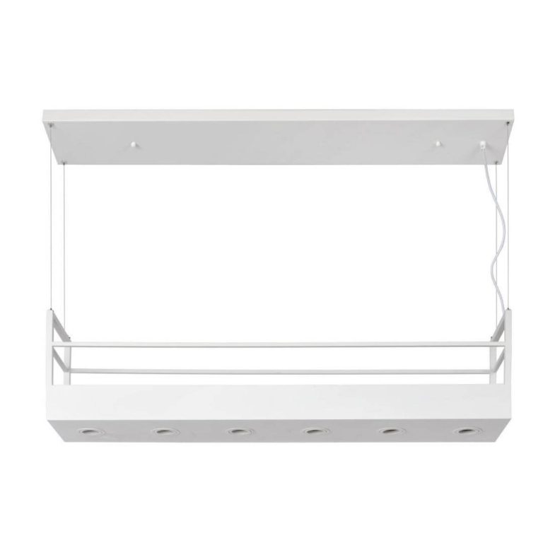 Ta wyjątkowo designerska podłużna lampa wisząca Miravelle w białym kolorze ma szerokość 112 cm oraz regulowaną wysokość – maksymalnie wynoszącą 160 cm. To idealny dodatek do powieszenia nad wyspę kuchenną lub blat roboczy. Na półce zmieścisz wszystkie najbardziej przydatne akcesoria. Lampa wisząca do kuchni i jadalni Miravelle sprawdza się także jako kwietnik i oczywiście jako praktyczne oświetlenie. Model przystosowany jest do aż sześciu źródeł światła.