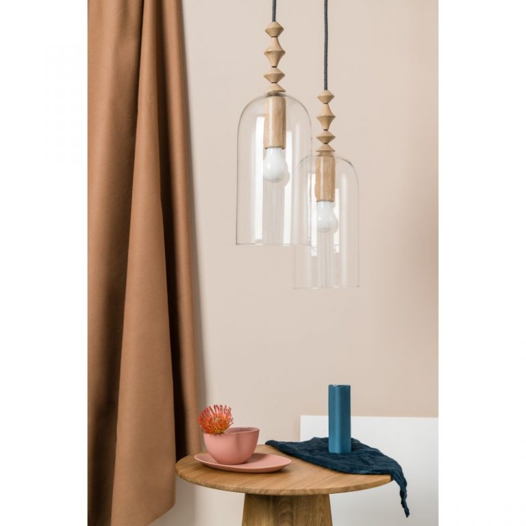 Podwójna lampa wisząca Hulub 2 pasować będzie także do mieszkań urządzonych w stylu klasycznym, a to za sprawą uniwersalnej kolorystyki oraz dekoracyjnie rzeźbionych drewnianych elementów. Natomiast transparentne klosze i czarne kable doskonale współgrać mogą ze stylem nowoczesnym i industrialnym.