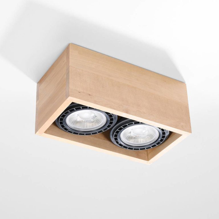Spot sufitowy w skandynawskim stylu Hormi 2 Wood ma kształt prostopadłościanu o szerokości 14 cm, wysokości 9 cm oraz długości 27 cm. Z powodzeniem możesz zamontować go w standardowym, ale również w nieco niższym pomieszczeniu. Może to być korytarz, biuro, kuchnia i niemal każde inne wnętrze. Podwójny spot sufitowy z drewna Hormi 2 Wood emituje punktowe światło i przystosowany jest do ledowych i klasycznych żarówek.