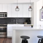 Biała lampa wisząca na listwie Enkel 3 L nad wyspę kuchenną