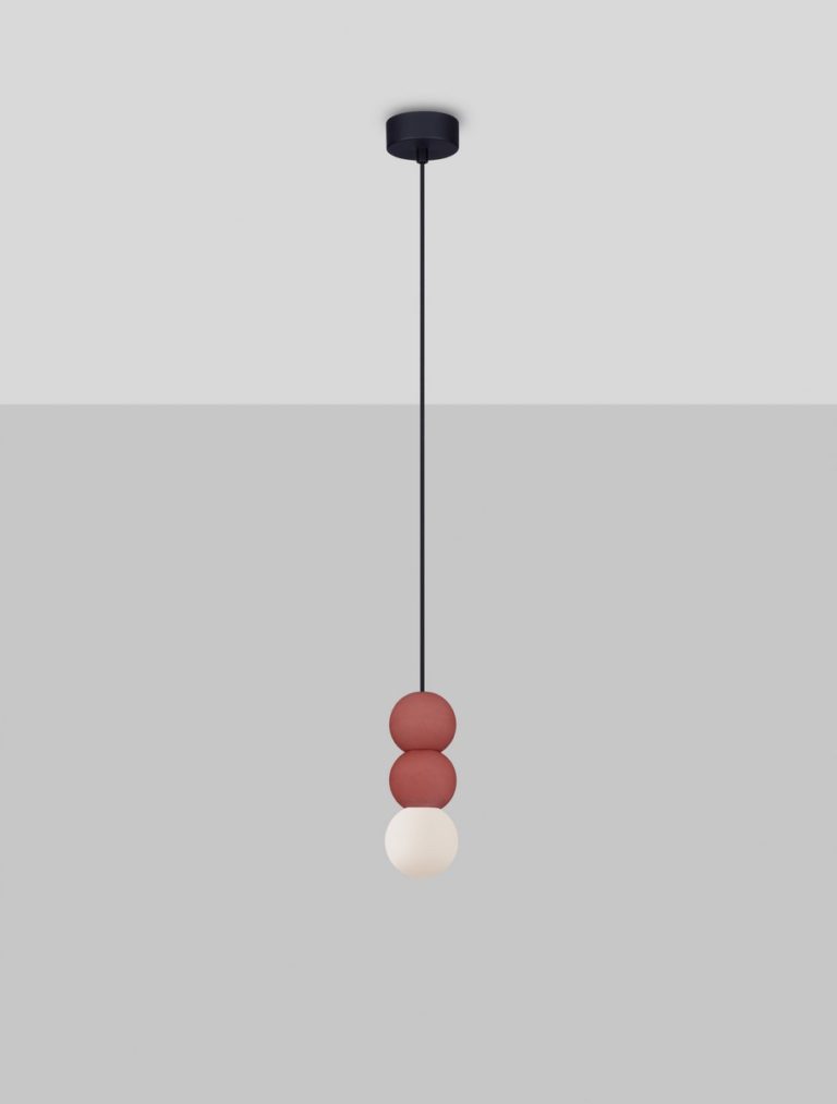 Kule z betonu w czerwonym kolorze sprawiają, że pojedyncza lampa wisząca Ibague B na czarnym stelażu przyciąga do siebie uwagę, natomiast geometryczna forma poszczególnych elementów nadaje jej subtelnej elegancji w nowoczesnym stylu. Lampa wisząca pojedyncza Ibague B wyposażona jest również w kulisty biały klosz, który rozpraszając światło, doskonale rozjaśnia wybrane miejsce.