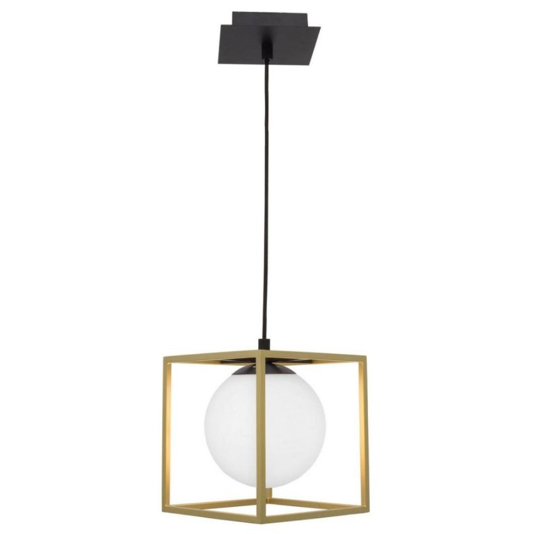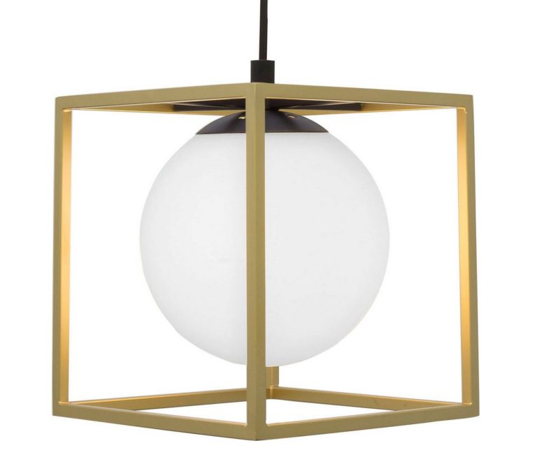 To wysokiej jakości model, który wykonany został z metalu i szkła. Lampa wisząca geometryczna Planta wyposażona jest w designerski klosz, składają się z białej kuli oraz okalającej ją sześciennej ramy w złotym kolorze. Całość uzupełnia czarny stelaż. Pojedyncza lampa wisząca Planta z geometrycznymi elementami posiada również regulowane zawieszenie – wystarczy, że skrócisz przewód, aby zawiesić oprawę nieco wyżej.
