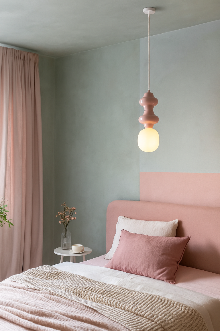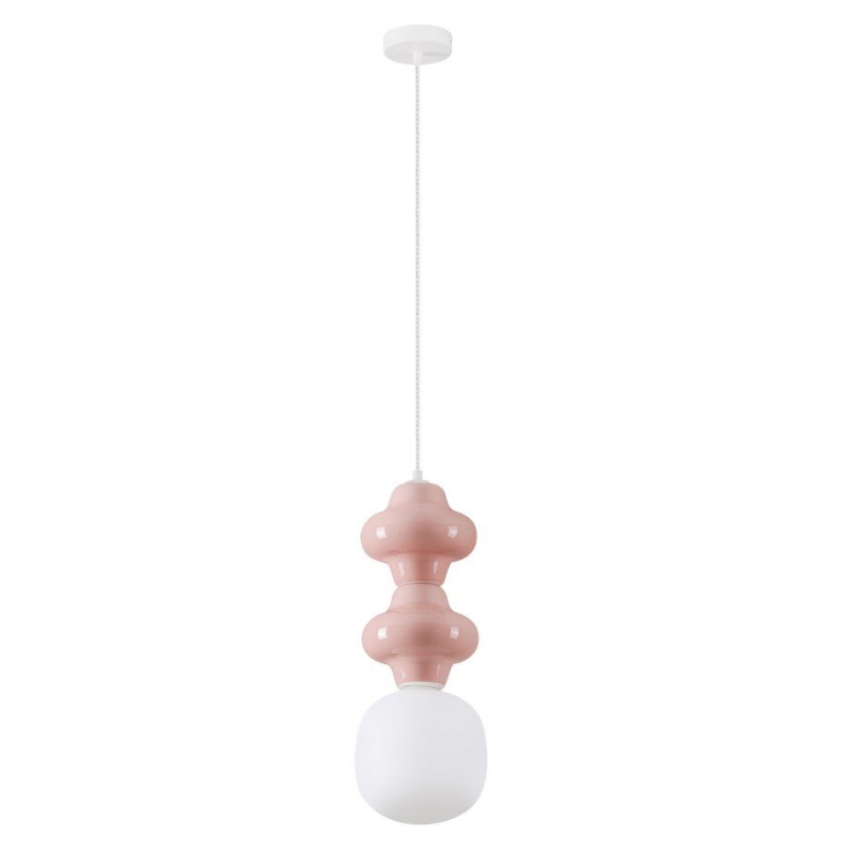 Pojedyncza lampa wisząca Vilrosa B na białym stelażu wyposażona jest w designerski klosz z białego szkła i różowej ceramiki, który jest najbardziej dekoracyjnym elementem całości. Lampa pojedyncza Vilrosa B wyróżnia się także oryginalną formą, która nadaje jej lekkości, a wraz z kolorystyką również subtelnego uroku.