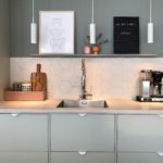 Biała lampa wisząca na listwie Enkel 3 L nad wyspę kuchenną