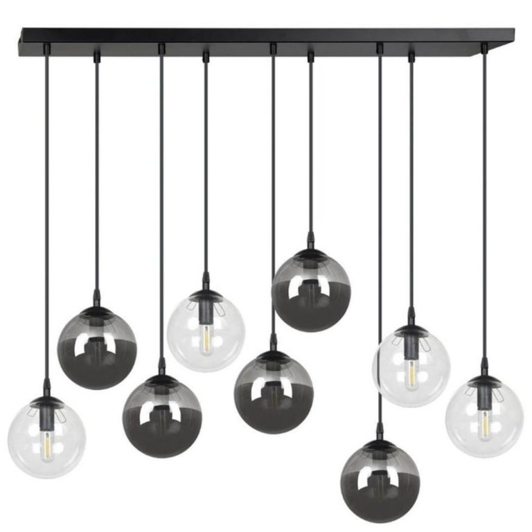 Duża salonowa lampa Blair 9 składa się z wyrazistej, podłużnej podsufitki o szerokości 92 cm oraz czarnych uchwytów trzymających dziewięć niezwykle efektownych szklanych kloszy. Cztery klosze są przezroczyste, pięć ma piękną grafitową barwę, dzięki której industrialny żyrandol jeszcze bardziej zyskuje na nowoczesności oraz galaktycznym charakterze. Kolejną, niewątpliwą zaletą lampy do salonu Blair 6 jest możliwość regulacji wysokości. Dwukolorowa lampa salonowa wisieć może minimalnie 40 cm, a maksymalnie nawet 100 cm od sufitu. Uwielbiamy tę uniwersalność oraz wyrazistość szklanego oświetlenia Blair, a Ty?