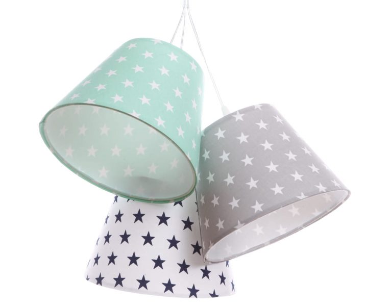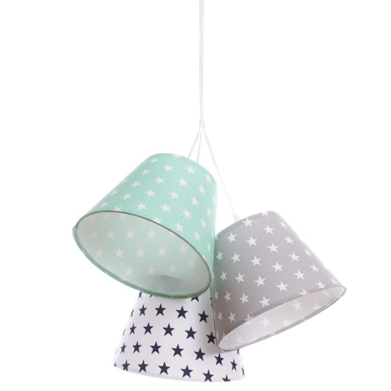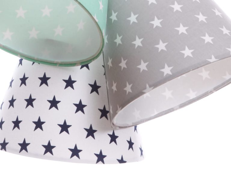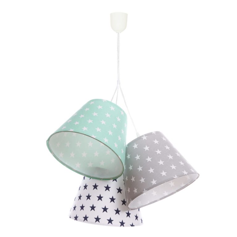 Lampa wisząca Inzo wyposażona została w aż trzy klosze identycznych wymiarów. Każdy z nich ma klasyczny, stożkowy kształt o dolnej średnicy 25 cm i wysokości 20 cm. Poszczególne abażury wykonane zostały z bezpiecznego w użytkowaniu tworzywa PCV, a następnie oklejone welurem z motywem gwiazdek. Każdy klosz ma jednak inny kolor: pierwszy z nich jest biały, drugi miętowy, a trzeci jasnoszary.