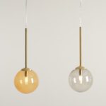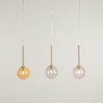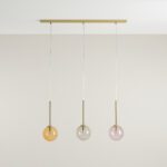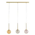 Podstawowe elementy potrójnej lampy wiszące Bosso 4 to podłużny stelaż z metalu w mosiężnym kolorze oraz trzy szklane klosze w kształcie idealnych kul. W omawianej oprawie świetlnej najbardziej wyróżniająca się jest tutaj kolorystyka kloszy, z których każdy ma zupełnie inny odcień – pomarańczowy, popielaty i brudnoróżowy. To właśnie dzięki kolorowym kulom lampa wisząca na listwie Bosso 4 wnosi do wnętrza przyjazną atmosferę, a jednocześnie znakomicie rozjaśnia przestrzeń.