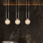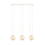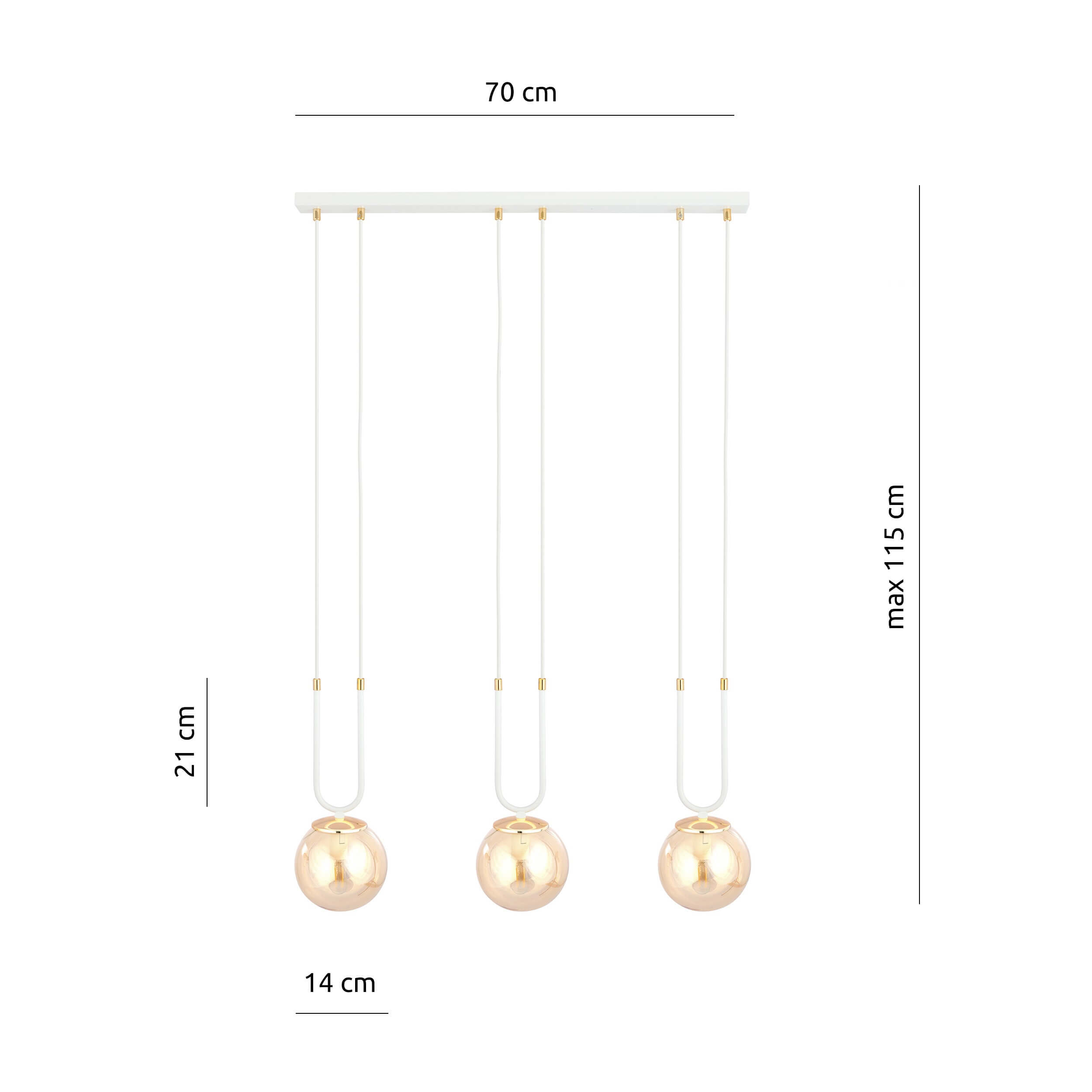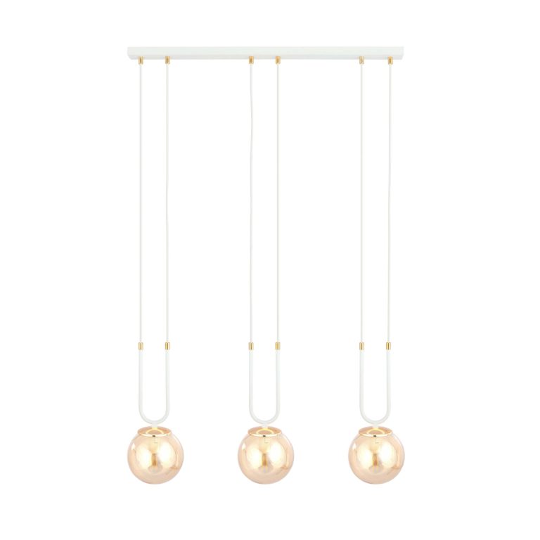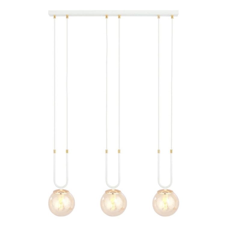 Polecana lampa wisząca nad stół Marga 3 charakteryzuje się przepiękną kolorystyką o wyjątkowo eleganckim charakterze. Niemal cała oprawa wykonana jest z metalu w białym kolorze. Urozmaiceniem są tutaj złote detale oraz przede wszystkim idealne w formie kuliste klosze ze szkła w miodowym odcieniu. Wszystkie elementy doskonale do siebie pasują i tworzą wyjątkowo wyrafinowaną całość, która idealnie prezentuje się na tle równie eleganckich i nowoczesnych aranżacji. Biała lampa wisząca ze złotymi detalami i miodowymi kloszami świetnie odnajdzie się także w zestawieniu ze stylem loftowym oraz industrialnym.