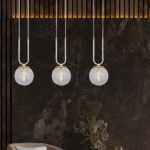 Tej uniwersalności sprzyja cała budowa oferowanej oprawy. Lampa wisząca do kuchni i jadalni Marga 3 składa się z listwy sufitowej i trzech kulistych kloszy na trzech podwójnych zwisach z regulacją. Opisywane oświetlenie w nowoczesnym stylu może mieć od 30 do nawet 115 cm długości oraz szerokość ma 70 cm. Cały stelaż wykonany został z metalu, a klosze z transparentnego szkła, które doskonale przepuszcza światło. Przezroczysta lampa nad wyspę kuchenną Marga 3 przeznaczona jest do trzech żarówek z małym gwintem E14 – na przykład do energooszczędnych ledów.