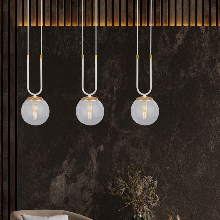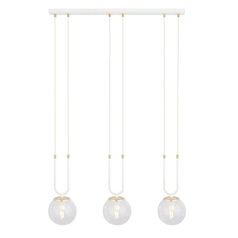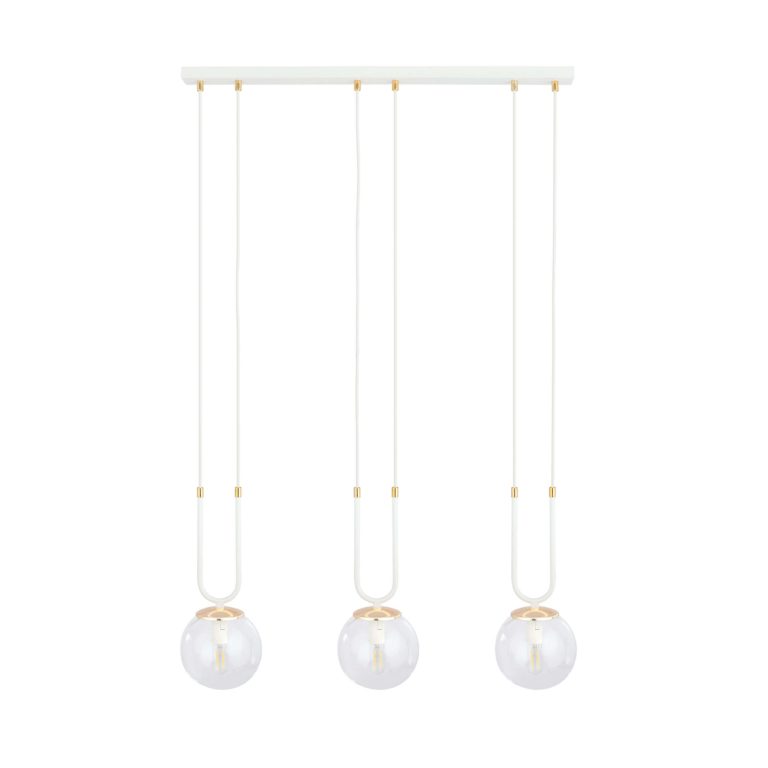 Lampa wisząca na listwie w designerskim stylu Marga 3 wykonana jest ze stali lakierowanej na biało i ozdobiona detalami w złotym kolorze. Kolorystyka ta prezentuje się niezwykle elegancko, sprawia, że aranżacja nabiera lekkości, a wnętrze przestronności. To doskonałe dodatek do wyposażenia nowoczesnego apartamentu. Potrójna lampa wisząca na listwie Marga 3 może stać się doskonałym oświetleniem niemal każdej przestrzeni Twojego domu – na przykład rozjaśniającym wyspę w kuchni, stół w jadalni lub ławę w salonie. Biała lampa wisząca ze złotymi detalami Marga 3 świetnie komponuje się z aranżacjami nowoczesnymi, loftowymi i industrialnymi.