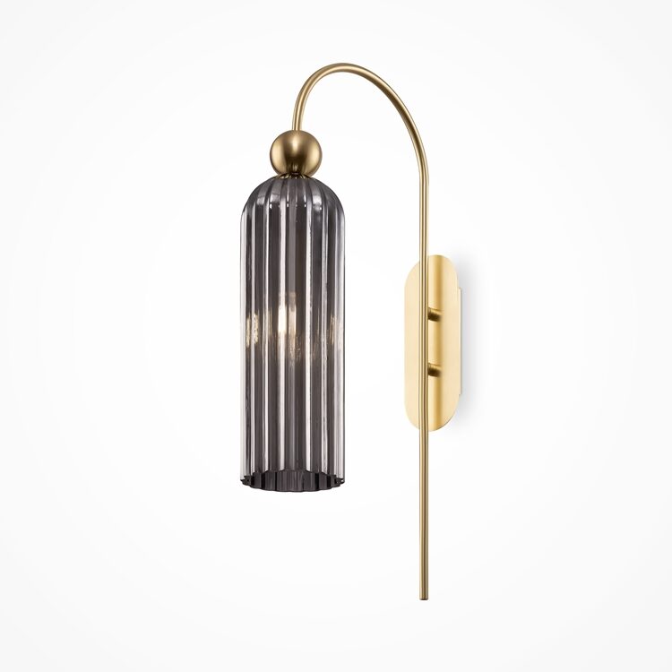 Kinkiet do salonu Antic ma 53,5 cm wysokości oraz głębokość 26,5 cm. Sam kosz ma kształt tuby o średnicy 10 cm. Przydymiony kinkiet ścienny Antic do salonu ze złotym stelażem pięknie prezentuje się w towarzystwie innych dekoracji wykonanych ze szkła i metalu. Pasuje również do antycznych mebli.