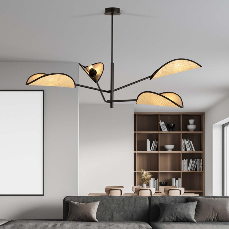 Prezentowana lampa sufitowa w stylu eko składa się z metalowego stelaża oraz kloszy z rattanu. Każdy abażur ma wygiętą, oryginalną formę, która sama w sobie jest już dekoracją. Naturalny kolor rattanu doskonale komponuje się z czarnym stelażem oraz lamówką, znajdującą się na brzegach tych nietypowych abażurów. Kolorystycznie, całość idealnie zgrywa się zarówno z łagodnymi, stonowanymi wnętrzami w stylu ekologicznym, jak i żywymi akcentami, inspirowanymi klimatem boho.