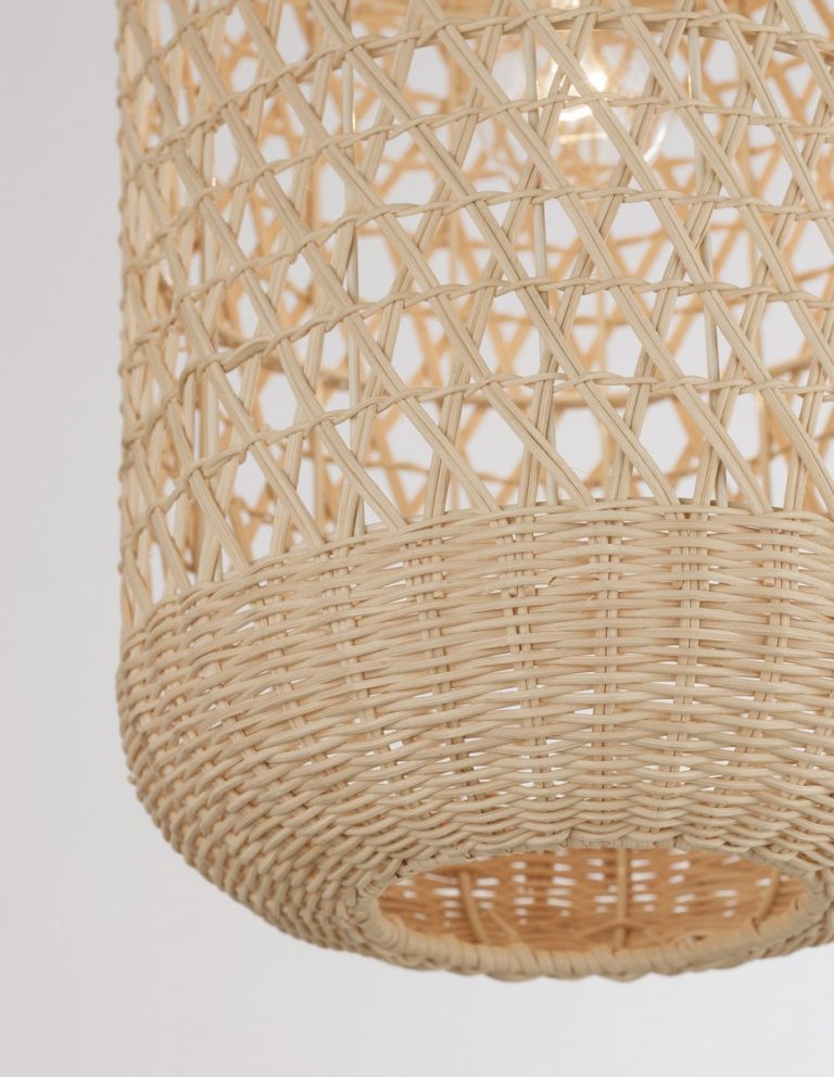 Rattanowa lampa wisząca przyciąga wzrok przede wszystkim za sprawą charakterystycznego cylindrycznego abażura. Jest on wykonany z rattanu, który cechuje się lekkością i naturalnym stylem. Zwróć uwagę na ozdobną, ażurową strukturę splotu, która czyni z klosza nie tylko estetyczny element ozdobny, ale również sprzyja nastrojowemu rozchodzeniu się światła wokół lampy. Dzięki temu, wnętrze oświetlone naszym rattanowym żyrandolem Palmar jest przytulne, ciepłe i eleganckie.
