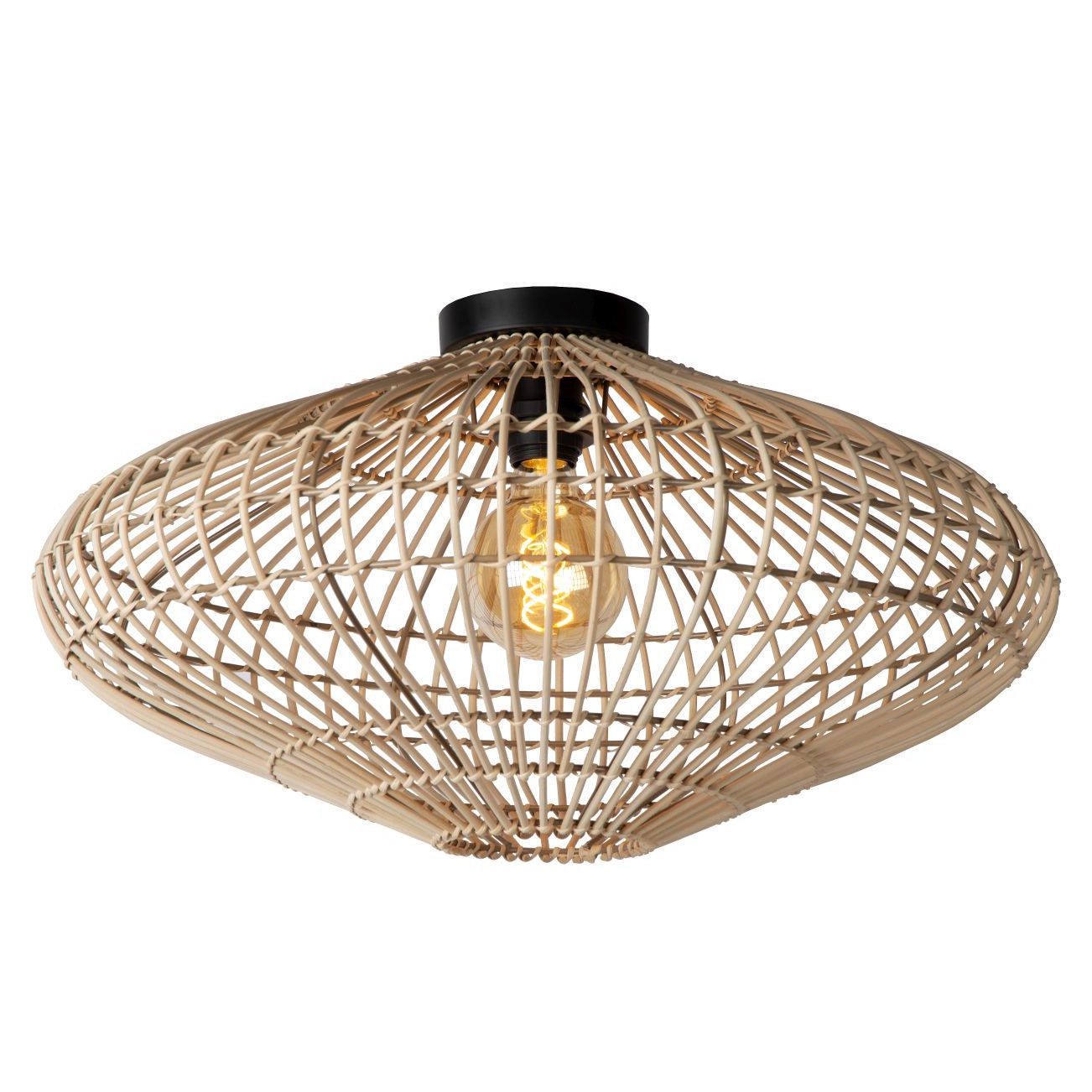 Oferowana przez nasz sklep lampa sufitowa Magali wyposażona jest w rattanowy abażur o naturalnym kolorze. Forma plecionki sprawia, że źródło światła jest jedynie delikatnie przysłonięte, a dodatkowo, gdy zaświecisz plafon, we wnętrzu tworzą się dekoracyjne refleksy. Klosz ma spłaszczony kształt, który również przykuwa do siebie uwagę. Średnica abażuru wynosi 56 cm, a jego wysokość 28 cm. Oprócz dekoracyjnego klosza z rattanu, plafon sufitowy w stylu boho Magali wyposażony jest też w czarną, okrągłą podsufitkę. Kolorystyka całości pozostaje neutralna, dzięki czemu prezentowany model pasuje zarówno do stonowanych, jak i bardziej kolorowych wnętrz.