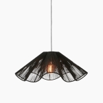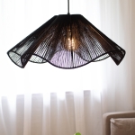 Ręcznie pleciony abażur z juty przyciąga wzrok ażurową strukturą oraz falistą formą, dzięki czemu w wyjątkowy sposób rozjaśnia wnętrze. Światło subtelnie przenika przez plecionkę, tworząc miękką grę światłocienia na ścianach i suficie, co sprawia, że Nami nie tylko oświetla przestrzeń, ale i tworzy klimat. Dzięki głębokiej czerni cała lampa nabiera wyrazistości i nuty tajemniczości, doskonale komponując się zarówno z aranżacjami nowoczesnymi, jak i inspirowanymi stylem boho oraz japandi.