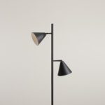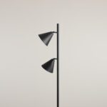Oferowana lampa stojące wyróżnia się prostą formą, dlatego nadaje przestrzeni lekkości. Regulowana lampa podłogowa w czarnym kolorze Form 2 składa się z okrągłej podstawy, prostego pojedynczego stelaża oraz dwóch kloszy w kształcie stożka. Wszystkie elementy, poza białym wnętrzem kloszy, są czarne.