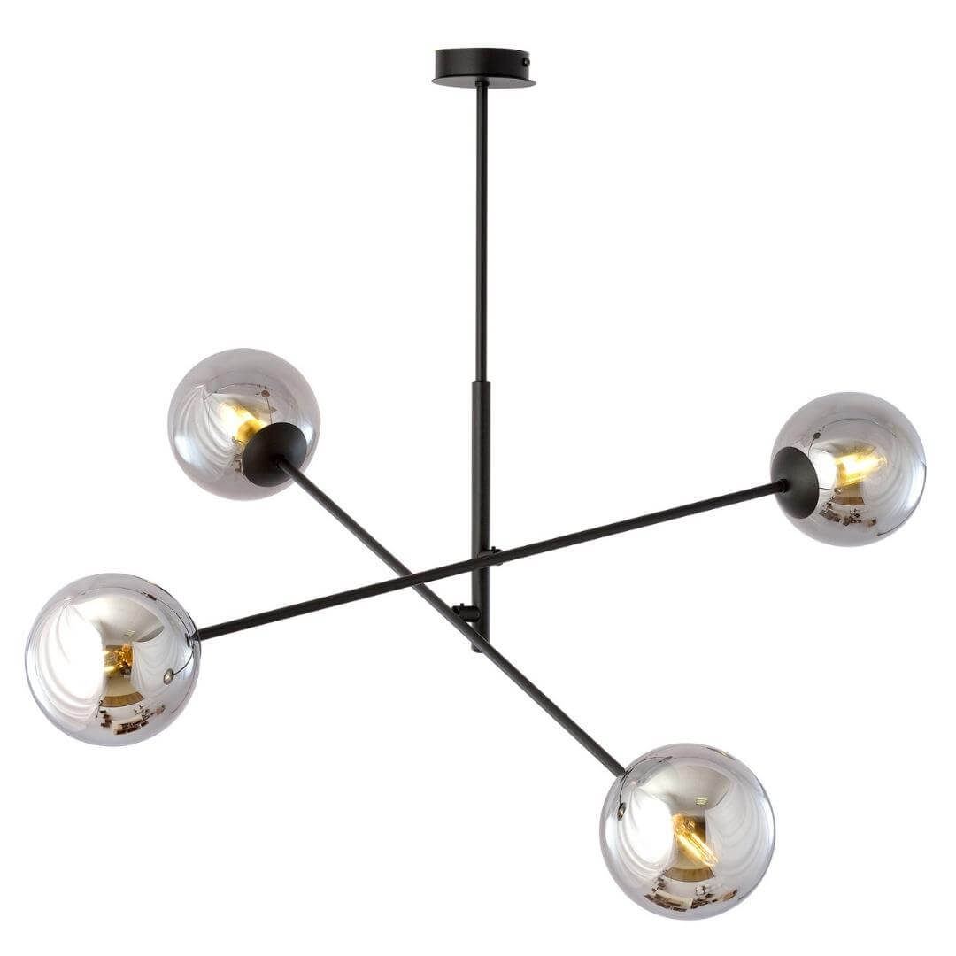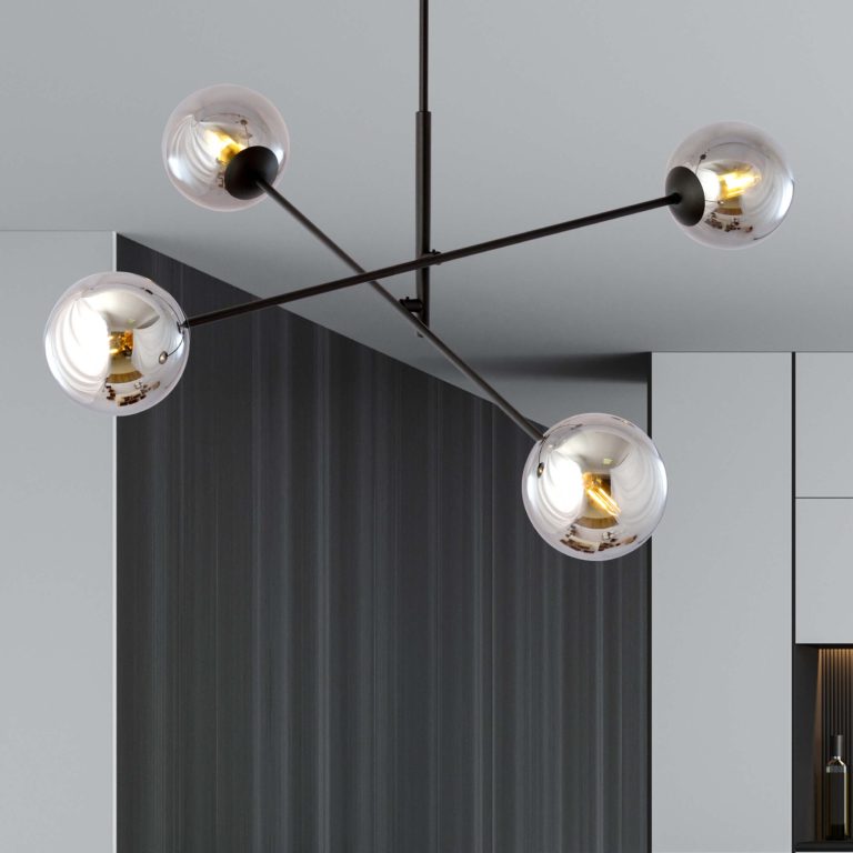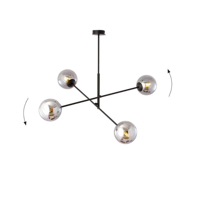 Jeśli chcesz dobrze poznać ten oferowany model, warto bliżej poznać jego budowę. Jest to oświetlenie wyposażone w solidny stelaż z ruchomymi ramionami oraz podsufitką. Cała ta część sufitowej lampy Frix 4 wykonana jest z wysokiej jakości, odpornej stali lakierowanej na czarno. Na obu krańcach każdego z ramion znajdują się zjawiskowo piękne klosze z popielatego szkła. Ich połyskujące wykończenie prezentuje się nadzwyczaj elegancko i sprawia, że wnętrze wypełnia się dodatkowym blaskiem.