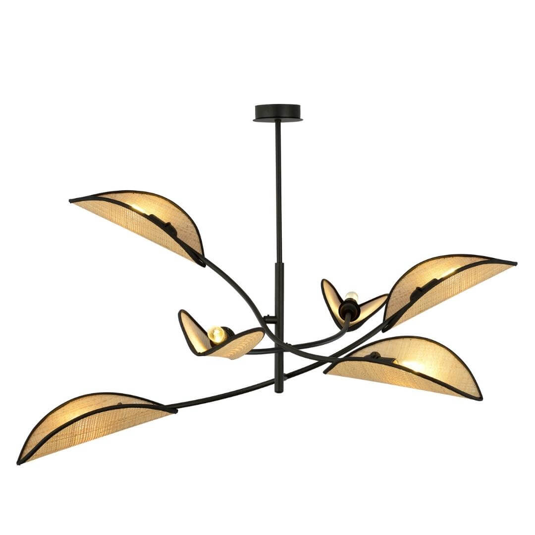 Stelaż lampy na sufit do salonu Erin 6 ma klasyczny, czarny kolor, który zawsze świetnie prezentuje się w aranżacjach. Barwa ta występuje też pod postacią lamówek okalających brzegi abażurów. Same klosze utrzymane są w jasnym odcieniu rattanu. Obie barwy wzajemnie się podkreślają, tworząc wyjątkowo zgrany duet. Cała lampa sufitowa z kloszami z rattanu Erin 6 doskonale pasuje do wnętrz rustykalnych, boho oraz skandynawskich.