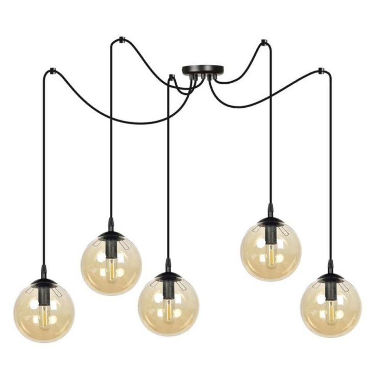 Rozłożysta lampa wisząca Blair 5 Spider szczególnie dobrze prezentować się będzie w roli żyrandola w centralnej części pomieszczenia. Możesz ją jednak również zamontować nad jadalnianym stołem czy w roli designerskie dekoracji świetlnej, która ozdobi całe wnętrze, a przy okazji wypełni je nastrojowym blaskiem. Warto tutaj wspomnieć o nietypowym kolorze kloszy, które dzięki miodowej barwie ocieplają światło.