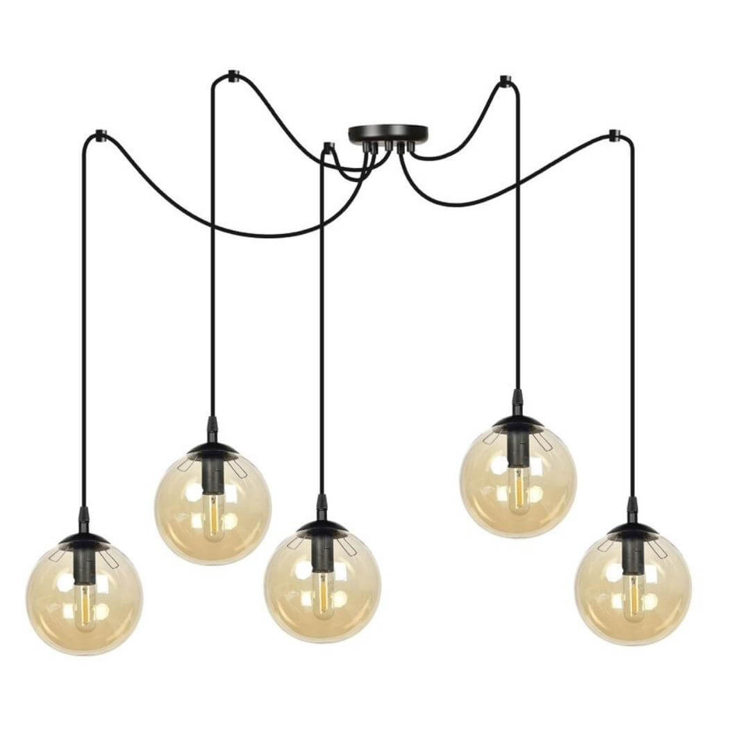 Wisząca lampa Blair 5 Spider to modne oświetlenie typu pająk, które doskonale sprawdza się w większych pomieszczeniach. Model ten wykonany został z metalu i składa się z okrągłej podsufitki, pięciu przewodów oraz kulistych kloszy ze szkła o oryginalnym, miodowym zabarwieniu. Każda kula ma identyczną średnicę 14 cm i wyposażona jest w jedno źródło światła.