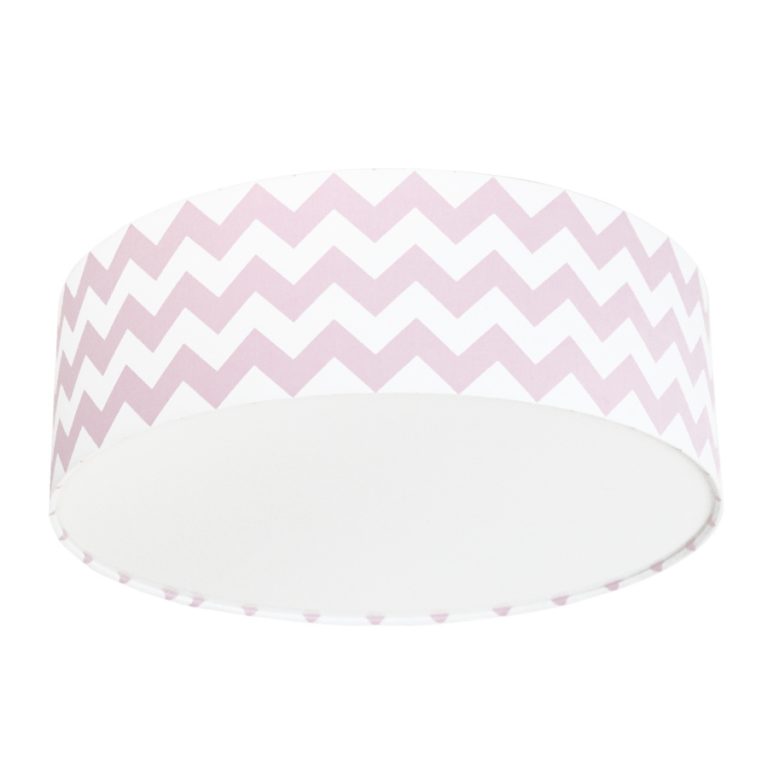 Płaska lampa przysufitowa Chevron ma średnicę 45 cm oraz wysokość 16 cm. To plafon, którym oświetlisz zarówno duże, jak i mniejsze pomieszczenie, również takie o niskiej kondygnacji. Klosz lampy pokryty jest bawełnianą tkaniną z niesamowicie efektowym wizualnie zygzakiem, zaś jego wnętrze jest białe oraz wyposażone w dolną osłonkę. Dzięki temu światło płynące z żarówki odbija się i jest równomiernie rozproszone po całym pomieszczeniu. Niesamowita jest ta kolorystyka oraz subtelne połączenie bieli z delikatnym różem, prawda?