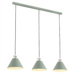 Lampa wisząca w kolorze szałwii Orte 3 wykonana jest z wysokiej jakości metalu; składa się z listwy sufitowej z trzema kloszami w kształcie stożków. Każdy z nich wyposażony jest w jedną oprawkę na źródło światła, którymi mogą być różne rodzaje żarówek E27. Szałwiowa lampa wisząca Orte 3 na listwie ma szerokość 126 cm oraz maksymalną wysokość 106 cm. Dzięki regulowanej długości możesz jednak ją skrócić i dostosować do danej aranżacji.
