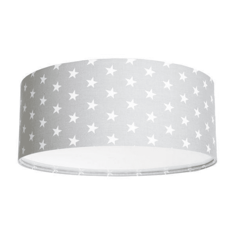 Płaska lampa przysufitowa w gwiazdki występuje w trzech rozmiarach: o średnicy 40 cm, 50 cm i 60 cm, dzięki czemu pasować będzie do każdej wielkości wnętrza. Wysokość lampy wynosząca zaledwie 15 cm, sprawia, że nie zabiera ona miejsca i idealnie nadaje się także do pomieszczeń o niższej kondygnacji. Płaski plafon pokryty jest aksamitnym welurem, którego miękka faktura sprzyja aurze przytulności i spokoju, a białe wnętrze pełni funkcję odbłyśnika i nadaje światłu jasny, ciepły i delikatnie rozproszony charakter. Jesteśmy fanami stonowanej, ale niezwykle dekoracyjnej stylistyki plafonu: szare tło idealnie komponuje się z regularnymi białymi gwiazdkami, prawda?