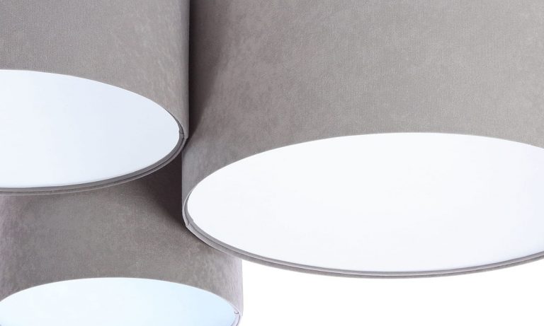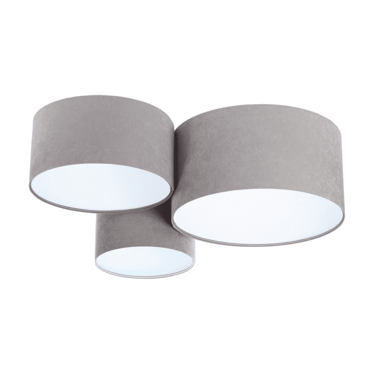 Nie tylko asymetryczny kształt potrójnego plafonu Tolu oraz jego szlachetna szara barwa czynią z niego oryginalną lampą sufitową. To także wykorzystanie najnowszego trendu we współczesnym designie oświetleniowym, a mianowicie weluru, którym pokryto walcowate klosze. Miękka faktura aksamitu pięknie przyjmuje i odbija światło oraz dodaje lampie szyku i dyskretnej elegancji. Ponadto, w zestawieniu z białym wnętrzem kloszy, które pełni funkcję odbłyśnika, tworzy niesamowity efekt oświetleniowy i wizualny. Istnieje również możliwość wyposażenia kloszy w dolną zabudowę – dzięki niej światło delikatnie się rozproszy, a wnętrze potrójnego plafonu zostanie zamaskowane. Uwielbiamy ten pomysł na źródło światła do salonu, a Ty?