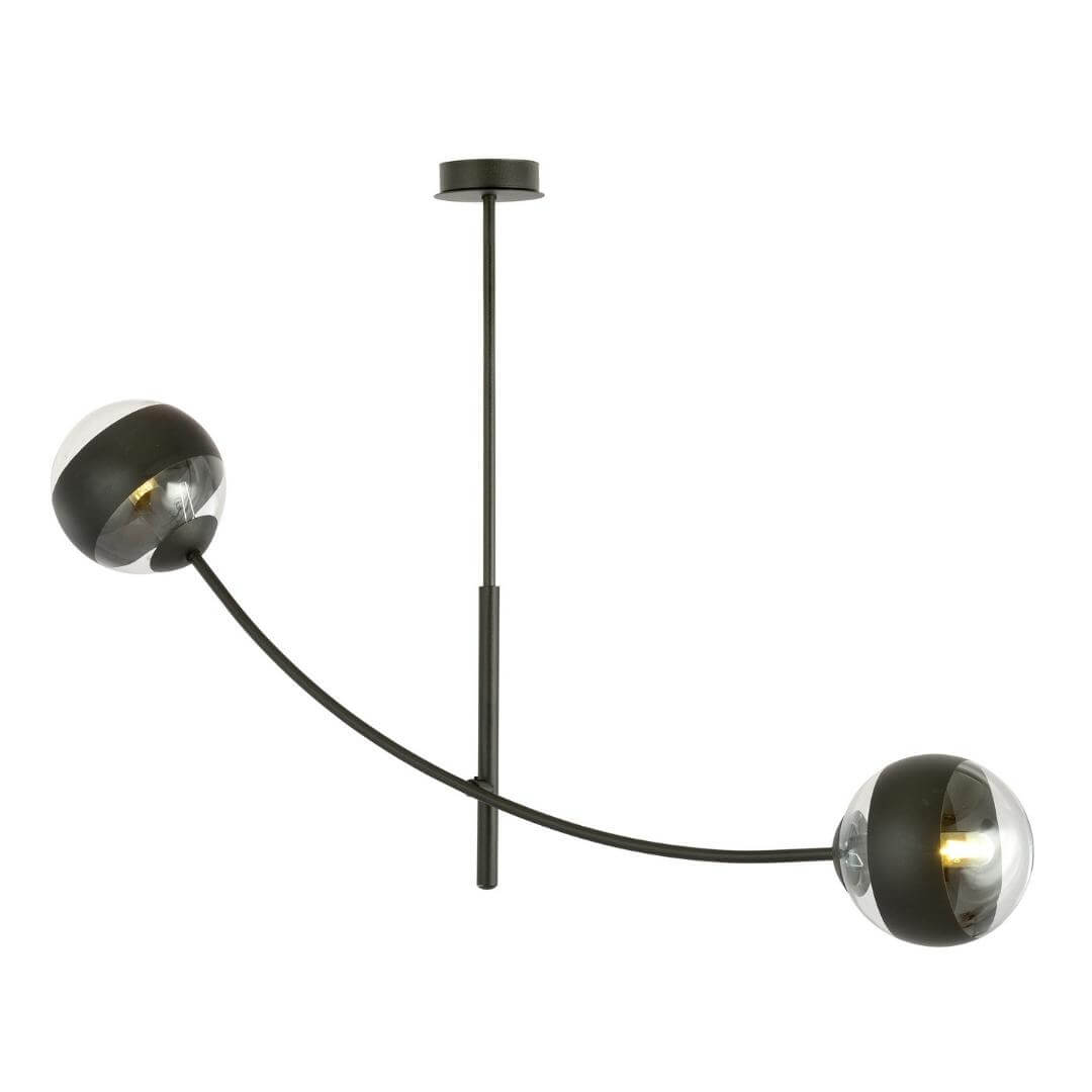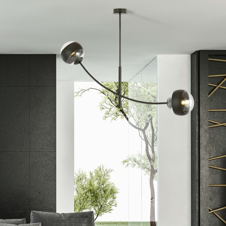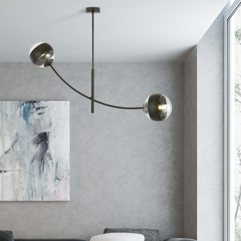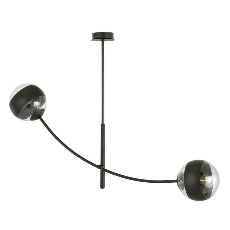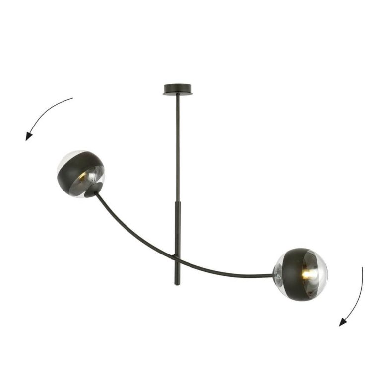 Oferowana przez nas lampa na sufit Orbis 2 to polski produkt, dlatego charakteryzuje ją zarówno modny design, jak i solidne wykonanie. Model ten wyposażony jest w ruchomy stelaż, który korzystnie wpływa na funkcjonalność całego oświetlenia. Został on wykonany ze stali lakierowanej na czarno, która zapewnia mu trwałość oraz nowoczesny wygląd. Oprócz stelaża, lampa sufitowa do salonu Orbis 2 składa się również z dwóch źródeł światła – oba z nich osłonięte są przez kuliste klosze. Te z kolei wykonano z transparentnego szkła, ozdobionego biegnącym przez środek czarnym paskiem.