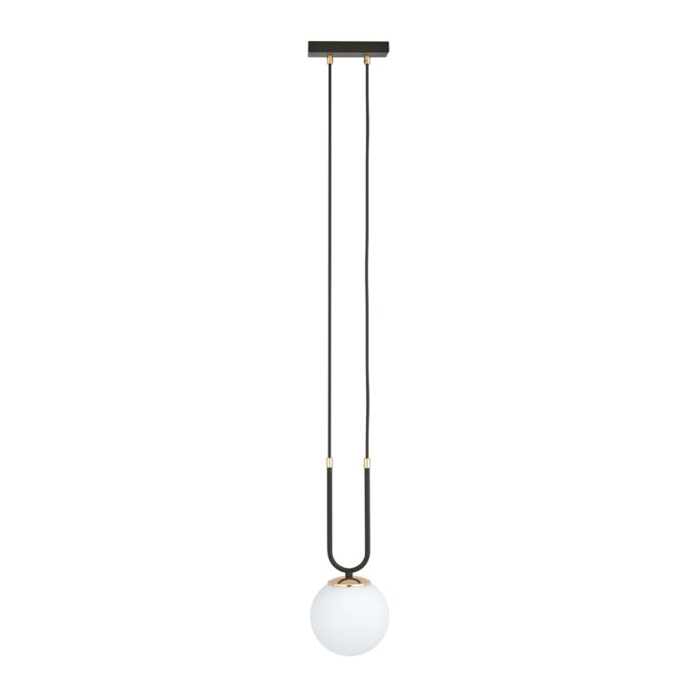 Szklany zwis do kuchni i jadalni Marga wyposażony jest w solidny metalowy stelaż w czarnym kolorze oraz w podwójne zawieszenie w tym samym odcieniu. Klosz wykonany został ze szkła o białej barwie, dzięki czemu perfekcyjnie rozprasza światło, a jednocześnie rozjaśnia całą oprawę również za dnia. Elegancji i blasku dodają całości złote detale, które powodują, że szklana lampa wisząca Marga doskonale pasuje zarówno do wnętrz nowoczesnych, jak i glamour. Z łatwością wkomponujesz ją także do wielu innych pomieszczeń i stylistyk – na przykład do industrialnego salonu lub eklektycznej sypialni. Pojedyncza lampa wisząca w czarnym kolorze genialnie będzie się prezentować po obu stronach sofy lub łóżka.