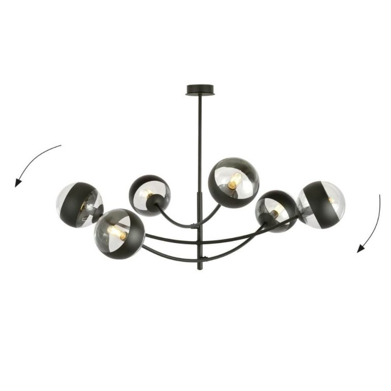 Lampa sufitowa z kloszami Orbis 6 wyposażona jest w ruchomy stelaż, który pomoże Ci dopasować światło do Twoich konkretnych potrzeb. Model ten charakteryzuje się też uniwersalną wielkością, która pasować będzie do praktycznie każdego salonu, sypialni, czy jadalni. Wysokość oświetlenia Orbis 6 wynosi 63 cm, szerokość 89 cm, a średnica każdego klosza 14 cm. Oferowany żyrandol do salonu przystosowano do sześciu źródeł światła E14.