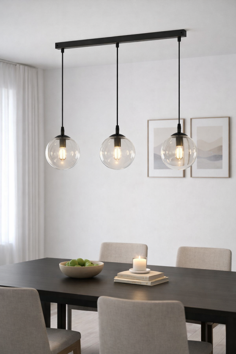 W stylu industrialnym liczy się przede wszystkim odpowiedni klimat. Pokoje zaaranżowane w tym stylu, powinny przypominać mieszkania zaadaptowane z warsztatów i innych pofabrycznych pomieszczeń. W takich pokojach musi znajdować się efektownie wyglądające światło, które podkreśli stylową aranżację. Transparentna lampa wisząca Blair 3 z kulistymi kloszami na pewno pomoże Ci stworzyć industrialną atmosferę.