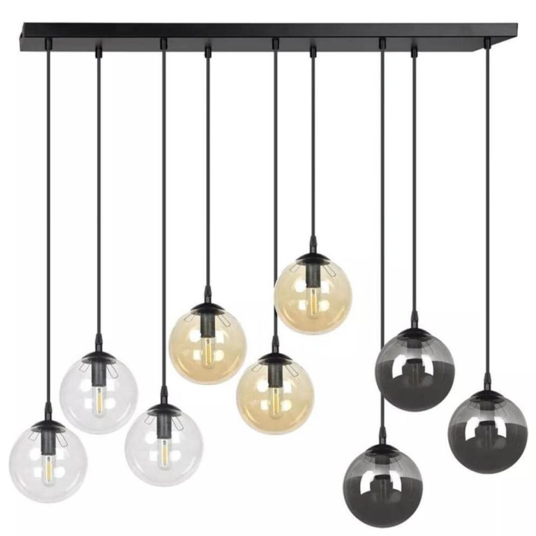Nowoczesna lampa do salonu składa się w czarnej, zdecydowanej podsufitki oraz dziewięciu regulowanych uchwytów trzymających kuliste i lekko przydymione klosze. Trzy klosze są w kolorze grafitowym, trzy w ciepłej barwie miodu, a pozostałe trzy wykonano z przezroczystego szkła. Każdy z nich ma średnicę równą 14 cm. Zwróć uwagę na czarną oprawę kloszy oraz wyrazisty czarny stelaż żyrandola – w połączeniu z trójkolorowymi kloszami tworzą fajne, harmonijne zestawienie, prawda? Dodatkowo szklane klosze nie tylko delikatnie rozpraszają światło, ale także odbijają je od swojej powierzchni. Będziesz zachwycony tym efektem!