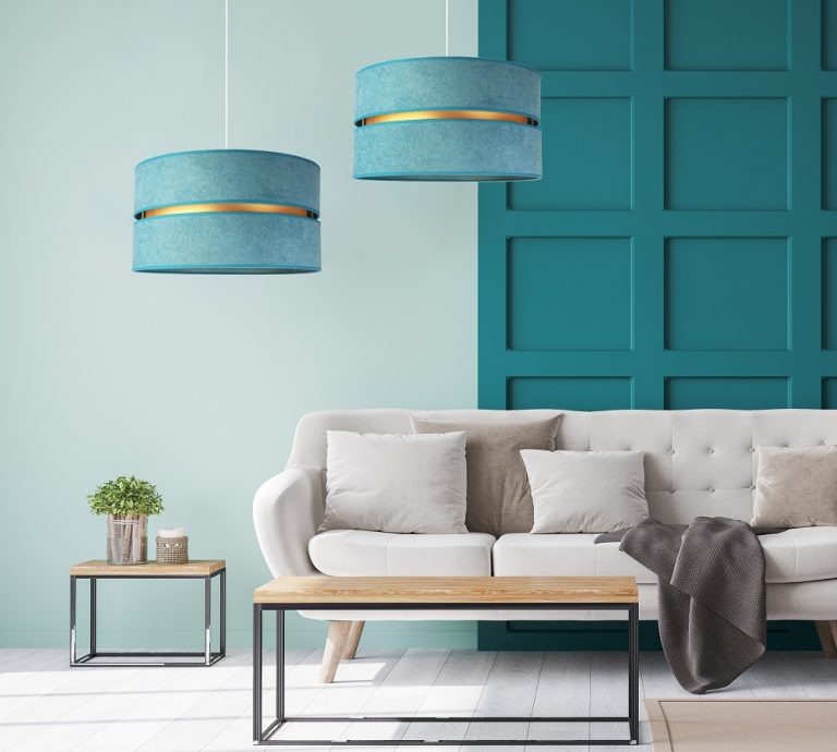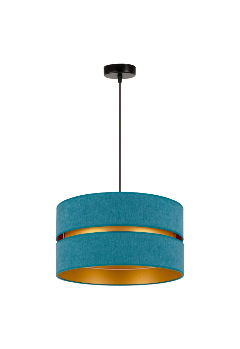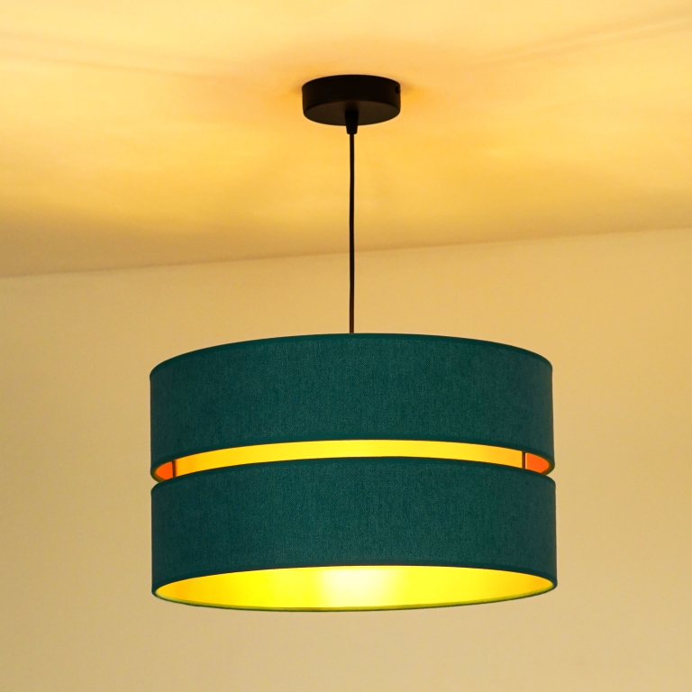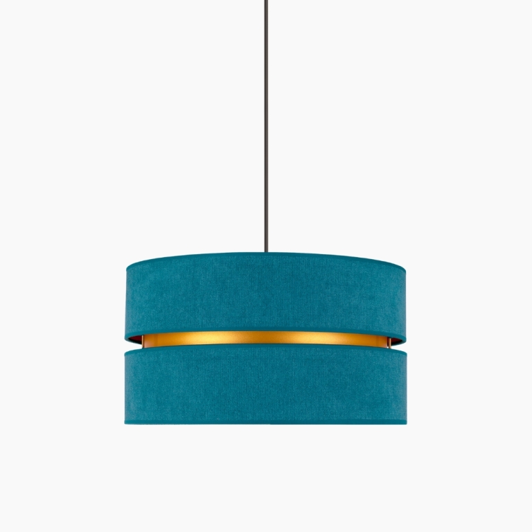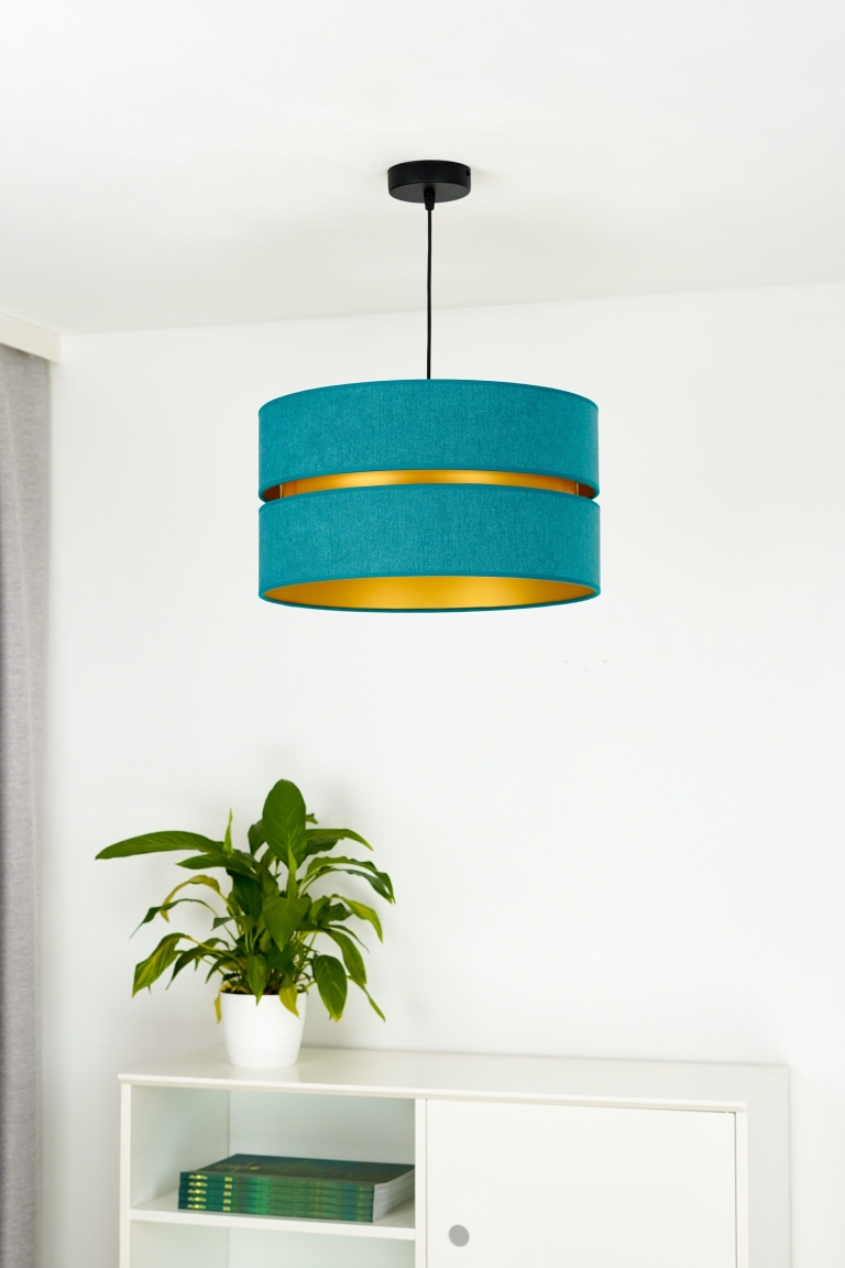 Tak jak i lampa, tak i jej kolory są zdecydowanie nieszablonowe. Ogólnie patrząc, model ten jest szykowny i elegancki. Lampa należy do całej kolekcji Duo, w której skład wchodzą m.in. plafony. Daje to duże możliwości, ponieważ możesz zdecydować się na lampę wiszącą i dodatkowe źródło światła w innej postaci. Gdy patrzymy na model Duo, przypominają nam się abażury klasycznych lamp wiszących, jednak w nim jest coś wyjątkowego. To wcięcie pośrodku wypełnione złotym kolorem, które przypomina plażę przy turkusowej lagunie.
