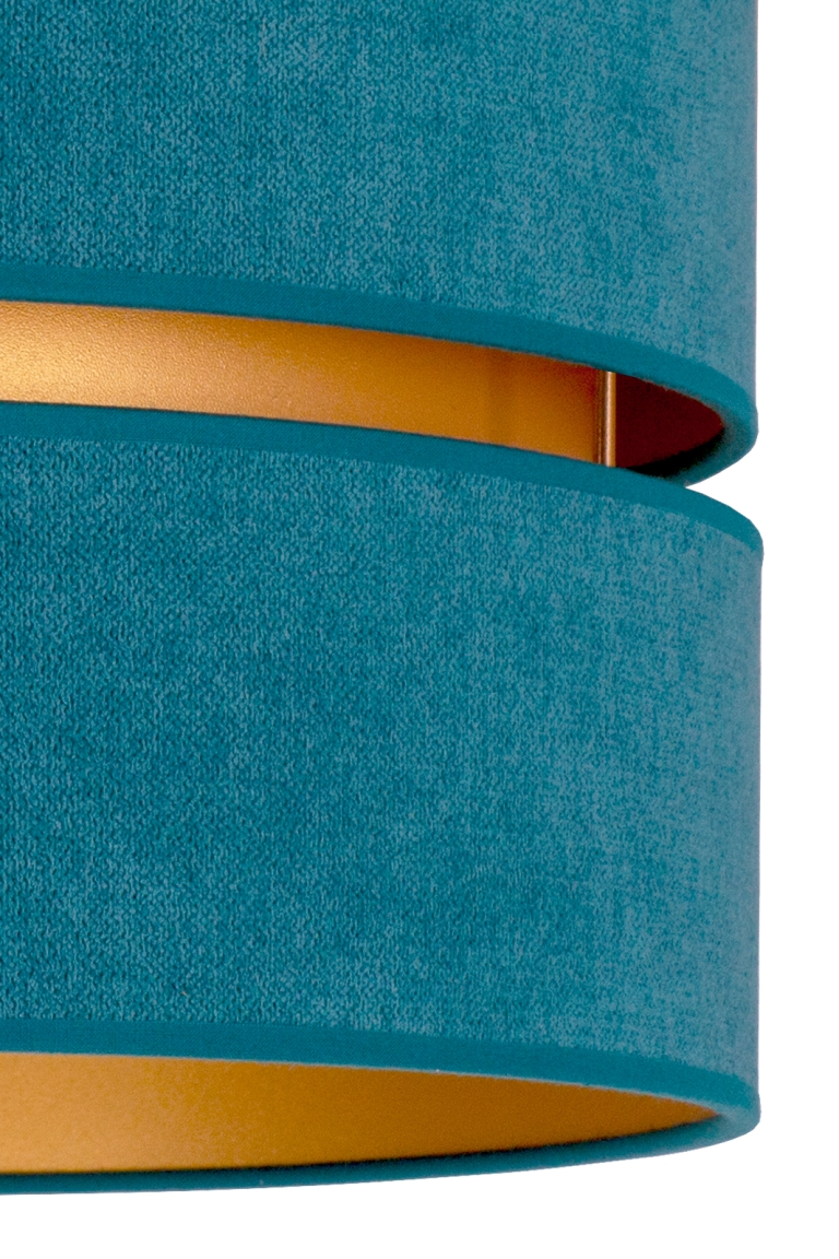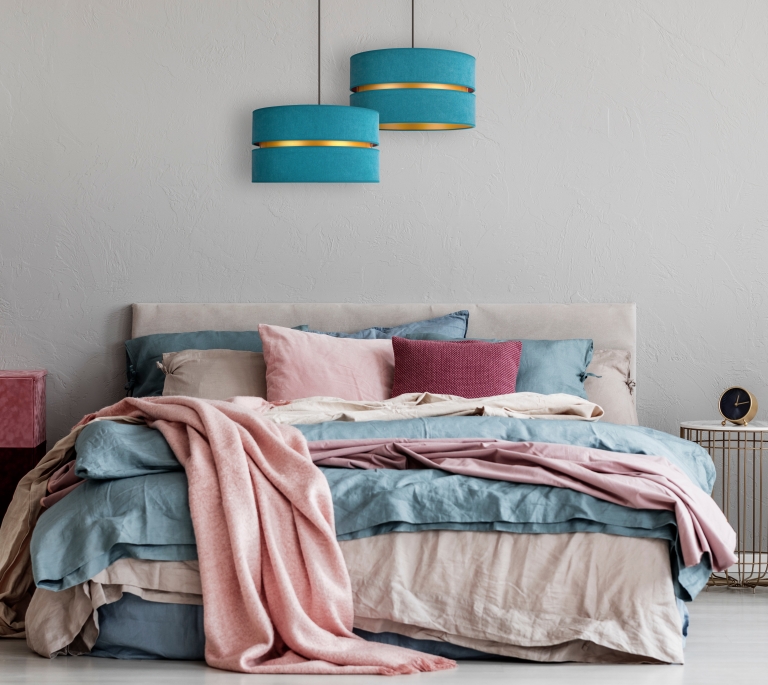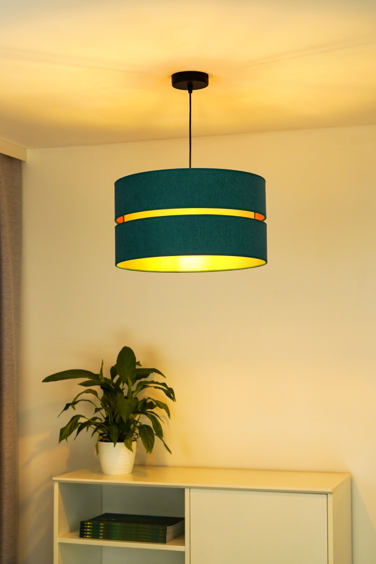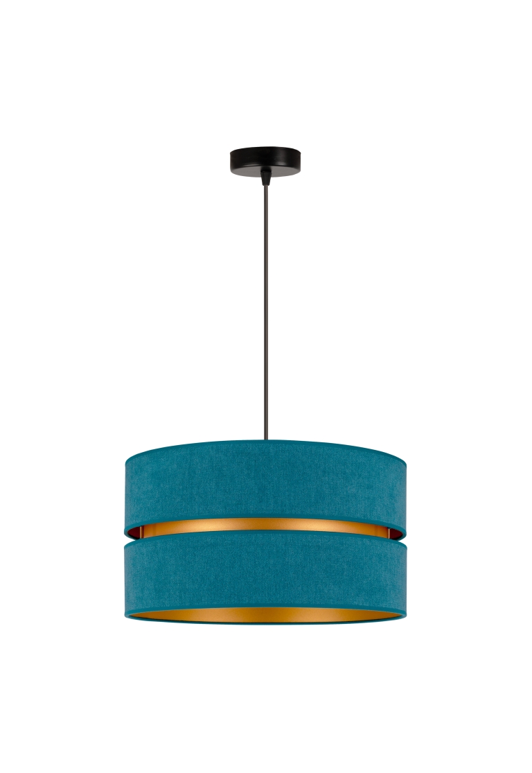 Tak jak i lampa, tak i jej kolory są zdecydowanie nieszablonowe. Ogólnie patrząc, model ten jest szykowny i elegancki. Lampa należy do całej kolekcji Duo, w której skład wchodzą m.in. plafony. Daje to duże możliwości, ponieważ możesz zdecydować się na lampę wiszącą i dodatkowe źródło światła w innej postaci. Gdy patrzymy na model Duo, przypominają nam się abażury klasycznych lamp wiszących, jednak w nim jest coś wyjątkowego. To wcięcie pośrodku wypełnione złotym kolorem, które przypomina plażę przy turkusowej lagunie.