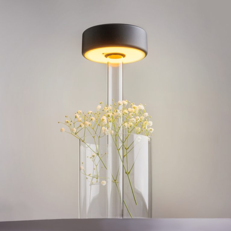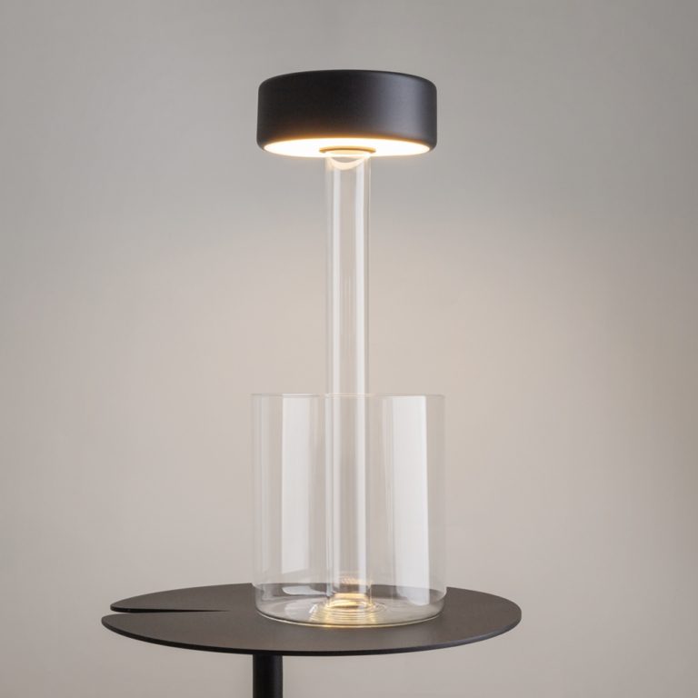 Jedną z głównych cech lampy szklanej Al Collaboration jest także zintegrowane oświetlenie LED o barwie światła od ciepłej do neutralnej. Ponadto unikatowa lampa stołowa Al Collaboration na szklanej podstawie posiada praktyczny włącznik dotykowy. Model ładuje się przy użyciu kabla USB.