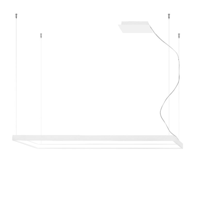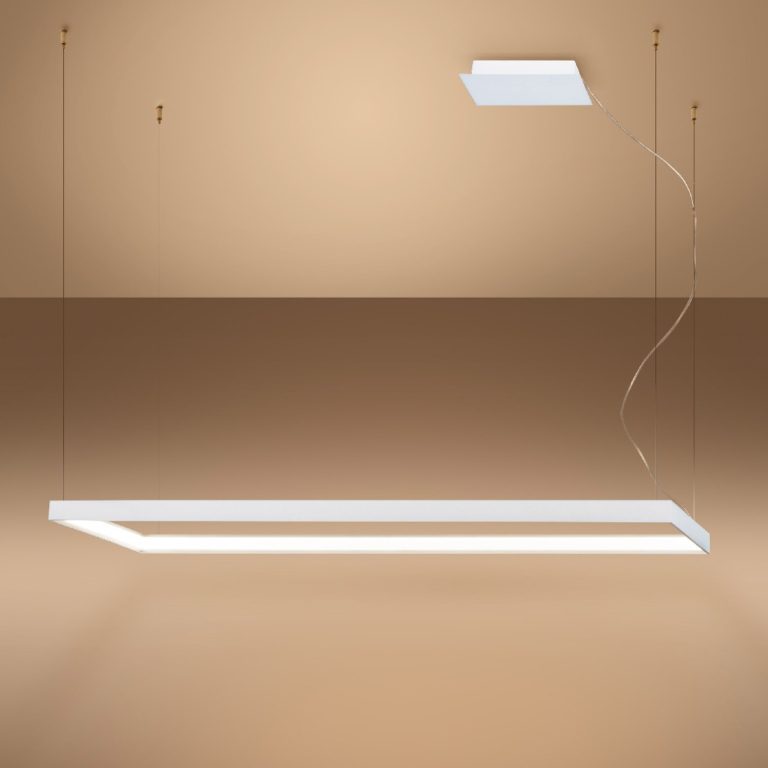 Lampa wisząca wyposażona została w designerski klosz w kształcie prostokąta, który pozwala równomiernie podświetlić wybraną przestrzeń. Model ma 130 cm szerokości, 40 cm głębokości i wyróżnia się możliwością zmiany wysokości zawieszenia (zakres regulacji od 60 do 150 cm). Możesz wykorzystać go zarówno w roli głównego, jak i dodatkowego źródła światła – w salonie, jadalni, sypialni, a nawet w stylowym biurze.