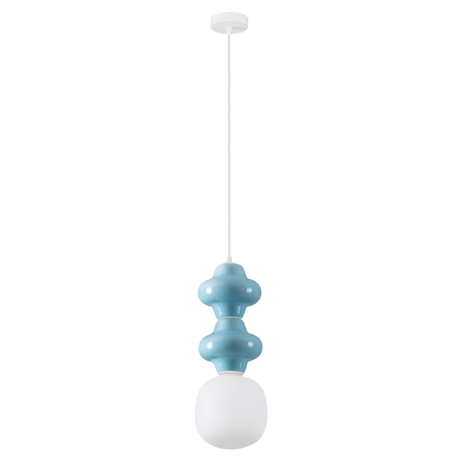 Urocza lampa wisząca Vilrosa B w niebieskim kolorze składa się z metalowej białej podsufitki, długiego przewodu zasilającego oraz designerskiego klosza ze szkła i ceramiki. Dodatkowo oferowana lampa w nowoczesnym stylu przystosowana jest do żarówek LED – energooszczędnych i długowiecznych.