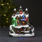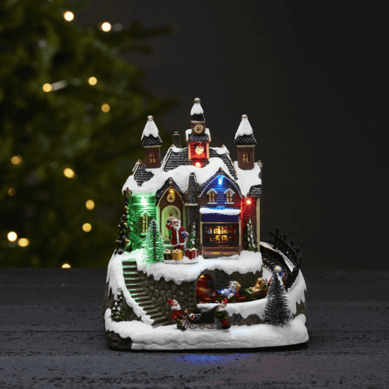 Oferowana dekoracja świąteczna ma postać scenki ze Świętym Mikołajem oraz innymi postaciami i motywami typowymi dla Bożego Narodzenia. Urocza wioska świąteczna LED pełni również funkcję świecącej pozytywki z jeżdżącym pociągiem, która umilać Ci będziesz czas podczas całych Świąt.