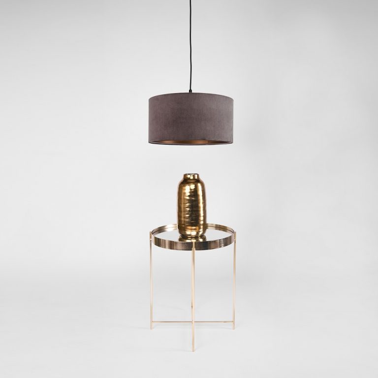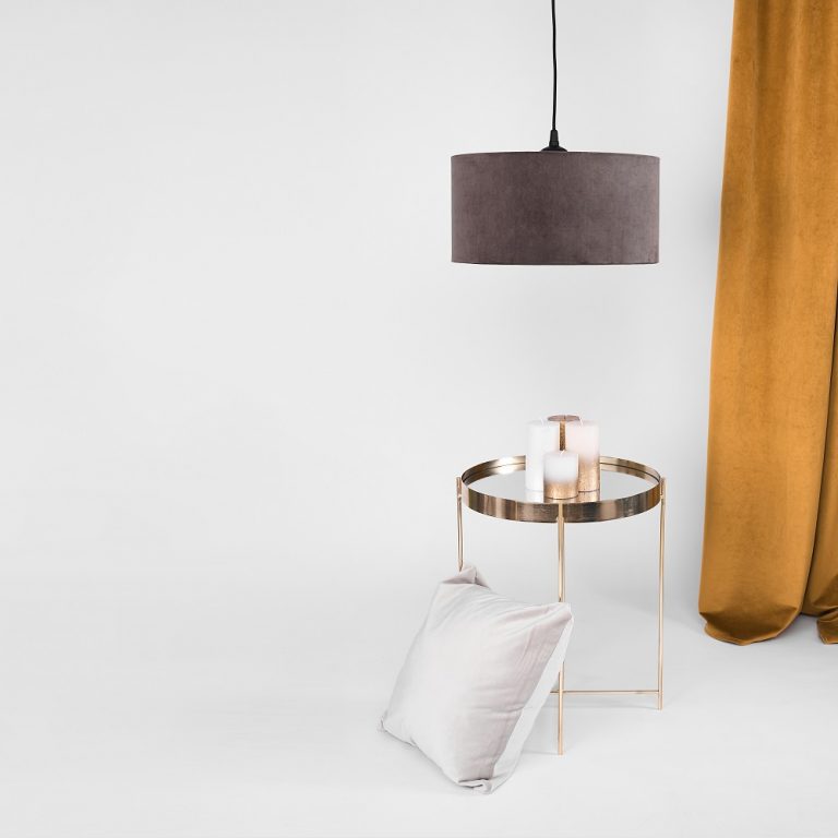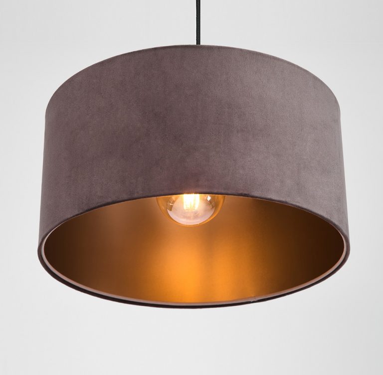 Proste, choć trochę nieoczywiste połączenia to coś, co zawsze się sprawdza w aranżacji wnętrz. Oświetlenie sufitowe jako element wyposażenia również może takie być. Welurowa lampa wisząca z abażurem Florencja jest tego najlepszym przykładem. Klasyczny kształt abażuru dzięki welurowej tkaninie w kolorze ciemnego, lekko szarawego beżu nadaje lampie stylowości. Jednak to co najbardziej przyciąga spojrzenia, to złote wnętrze. Efektownie kontrastuje z połyskującym welurem, szczególnie przy włączonym świetle, jednocześnie pięknie je odbijając. Dzięki takiemu połączeniu lampa wygląda wyjątkowo elegancko, welur kojarzy cię z ciepłem i przytulnością, a złoto z luksusem.
