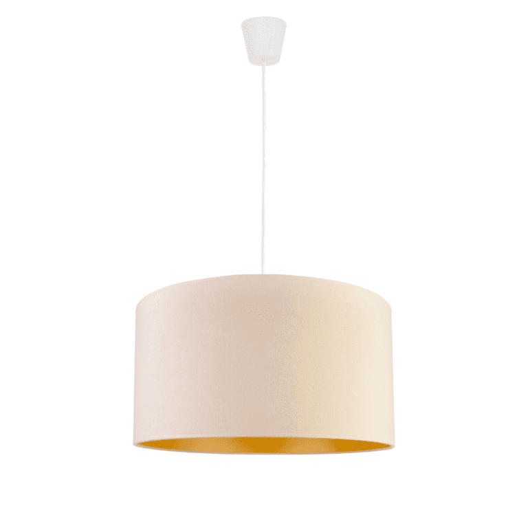 Lampy wiszące to wciąż jeden z najlepszych akcentów dekoracyjnych wnętrz. Abażur lampy wykonany został z najwyższej jakości tkaniny welurowej, dzięki czemu jest odporny na uszkodzenia. Jego materiał jest miękki i miły w dotyku, dlatego nada się również do wnętrz, które będzie mógł ocieplić. Choć zewnętrzna część abażura w kolorze écru nie rzuca się w oczy, to jego wewnętrzna część wykończona złotą folią robi naprawdę wielkie wrażenie.